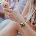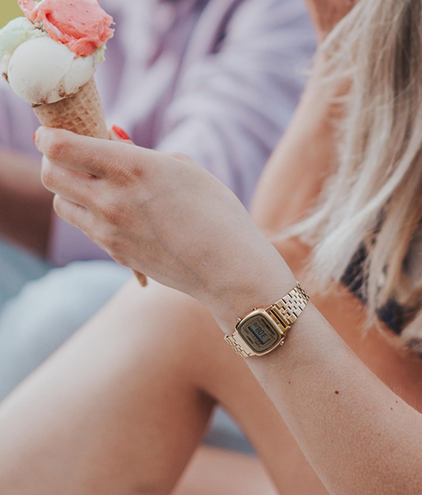 Женские электронные часы. Оснащены функциями: секундомера, таймера, календаря и подсветки. Корпус - Пластиковый; Стекло - Пластик; Водозащита - 30 м. (WR 30); Материал ремешка - Нержавеющая сталь, PVD покрытие; Цвет ремешка - Золотистый; Цвет циферблата - Золотой.