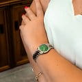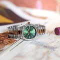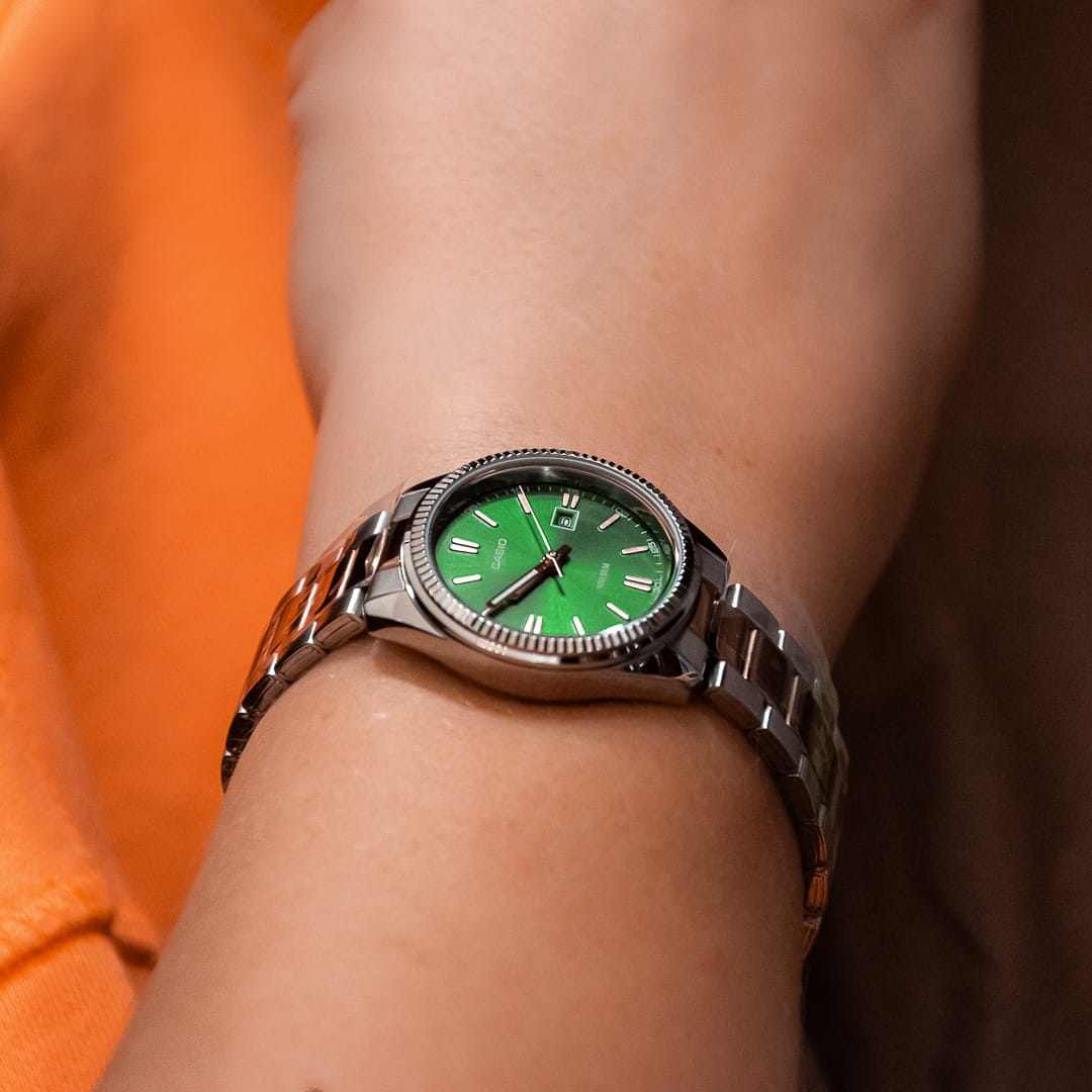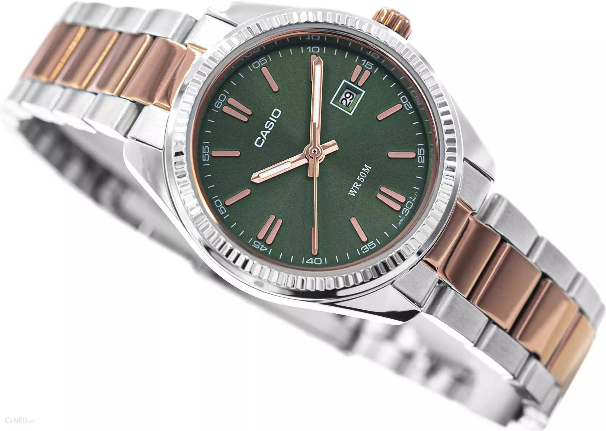 Японские женские часы Casio Collection LTP-1302PRG-3AVEF с минеральным стекломМинеральное стеклоМинеральное стекло представляет собой искусственно выращенный минерал кварца. Такое стекло отличается особой устойчивостью к повреждениям и царапинам. Уступает по некоторым качествам сапфировому стеклу.. Светящееся покрытие обеспечивает длительную подсветку в темное время суток после короткого воздействия света. Корпус выполнен из гипоаллергенной латуни. Модель комплектуется надёжным механизмом, точность хода которого составляет +/- 20 сек/мес. Стрелки с люминесцентным покрытиемЛюминесцентное покрытиеПозволяет считывать показания времени в темноте. Производители наносят на стрелки, часовые индексы, безель или поверхность циферблата светонакопительный состав, дающий холодное свечение.. Стальной браслет на раскладной застёжкеРаскладная застёжкаТакой тип застёжки используется только на браслетах из металла. Она никогда не раскрывается полностью, происходит разделение на 2 и более частей. Раскладывающая застёжка снизит вероятность потери часов к минимуму. с IP-покрытиемIP-покрытиеМетод ионного напыления. Демонстрирует повышенную устойчивость к истиранию, окислению и химическим веществам. Под воздействием высокого давления и температуры около 1500°C молекулы металла надёжно соединяются с частицами корпуса часов.. Окошко даты находится в положении 3 часа. Водонепроницаемость  50 метров, позволит защитить корпус от случайных брызг или капель дождя.