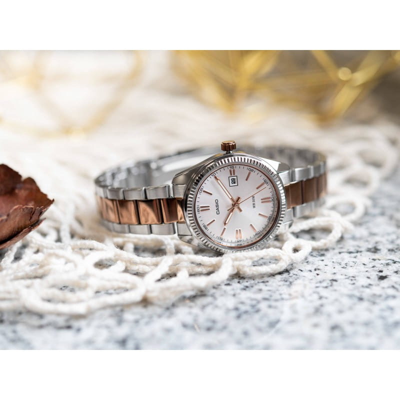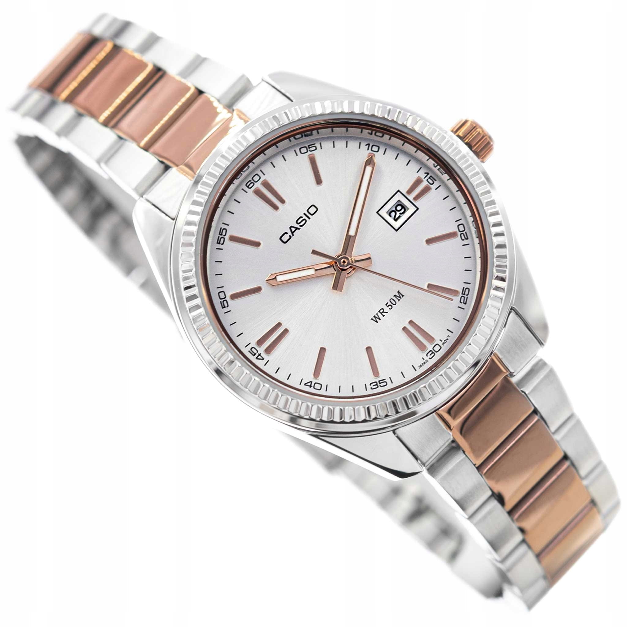 Японские женские часы Casio Collection LTP-1302PRG-7AVEF с минеральным стекломМинеральное стеклоМинеральное стекло представляет собой искусственно выращенный минерал кварца. Такое стекло отличается особой устойчивостью к повреждениям и царапинам. Уступает по некоторым качествам сапфировому стеклу.. Светящееся покрытие обеспечивает длительную подсветку в темное время суток после короткого воздействия света. Корпус выполнен из гипоаллергенной латуни. Модель комплектуется надёжным механизмом, точность хода которого составляет +/- 20 сек/мес. Стрелки с люминесцентным покрытиемЛюминесцентное покрытиеПозволяет считывать показания времени в темноте. Производители наносят на стрелки, часовые индексы, безель или поверхность циферблата светонакопительный состав, дающий холодное свечение.. Стальной браслет на раскладной застёжкеРаскладная застёжкаТакой тип застёжки используется только на браслетах из металла. Она никогда не раскрывается полностью, происходит разделение на 2 и более частей. Раскладывающая застёжка снизит вероятность потери часов к минимуму. с IP-покрытиемIP-покрытиеМетод ионного напыления. Демонстрирует повышенную устойчивость к истиранию, окислению и химическим веществам. Под воздействием высокого давления и температуры около 1500°C молекулы металла надёжно соединяются с частицами корпуса часов.. Окошко даты находится в положении 3 часа. Водонепроницаемость 50 метров, позволит защитить корпус от случайных брызг или капель дождя.