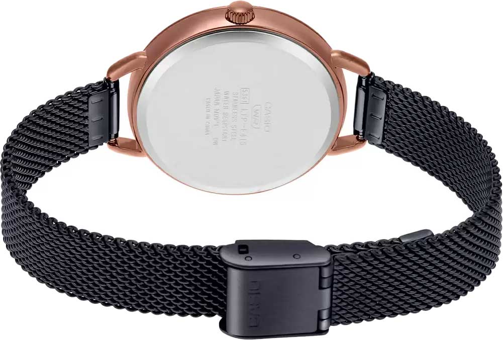 Японские женские часы Casio Collection LTP-E415MBR-1C из коллекции LTP с минеральным стекломМинеральное стеклоМинеральное стекло представляет собой искусственно выращенный минерал кварца. Такое стекло отличается особой устойчивостью к повреждениям и царапинам. Уступает по некоторым качествам сапфировому стеклу. изящно смотрятся на запястье, они привлекают классическим исполнением и правильной геометрией. Минималистичная модель станет отличным решением для любого случая: на работу, переговоры с деловыми партнёрами, прогулку с друзьями или праздничный вечер. Отсутствуют лишние детали, что позволяет часам быть актуальными на долгие годы. Корпус выполнен из нержавеющей стали с IP-покрытиемIP-покрытиеМетод ионного напыления. Демонстрирует повышенную устойчивость к истиранию, окислению и химическим веществам. Под воздействием высокого давления и температуры около 1500°C молекулы металла надёжно соединяются с частицами корпуса часов.. Браслет миланского плетения с раскладной застёжкойРаскладная застёжкаТакой тип застёжки используется только на браслетах из металла. Она никогда не раскрывается полностью, происходит разделение на 2 и более частей. Раскладывающая застёжка снизит вероятность потери часов к минимуму.. Модель комплектуется надёжным механизмом, точность хода которого составляет +/- 20 сек/мес.
