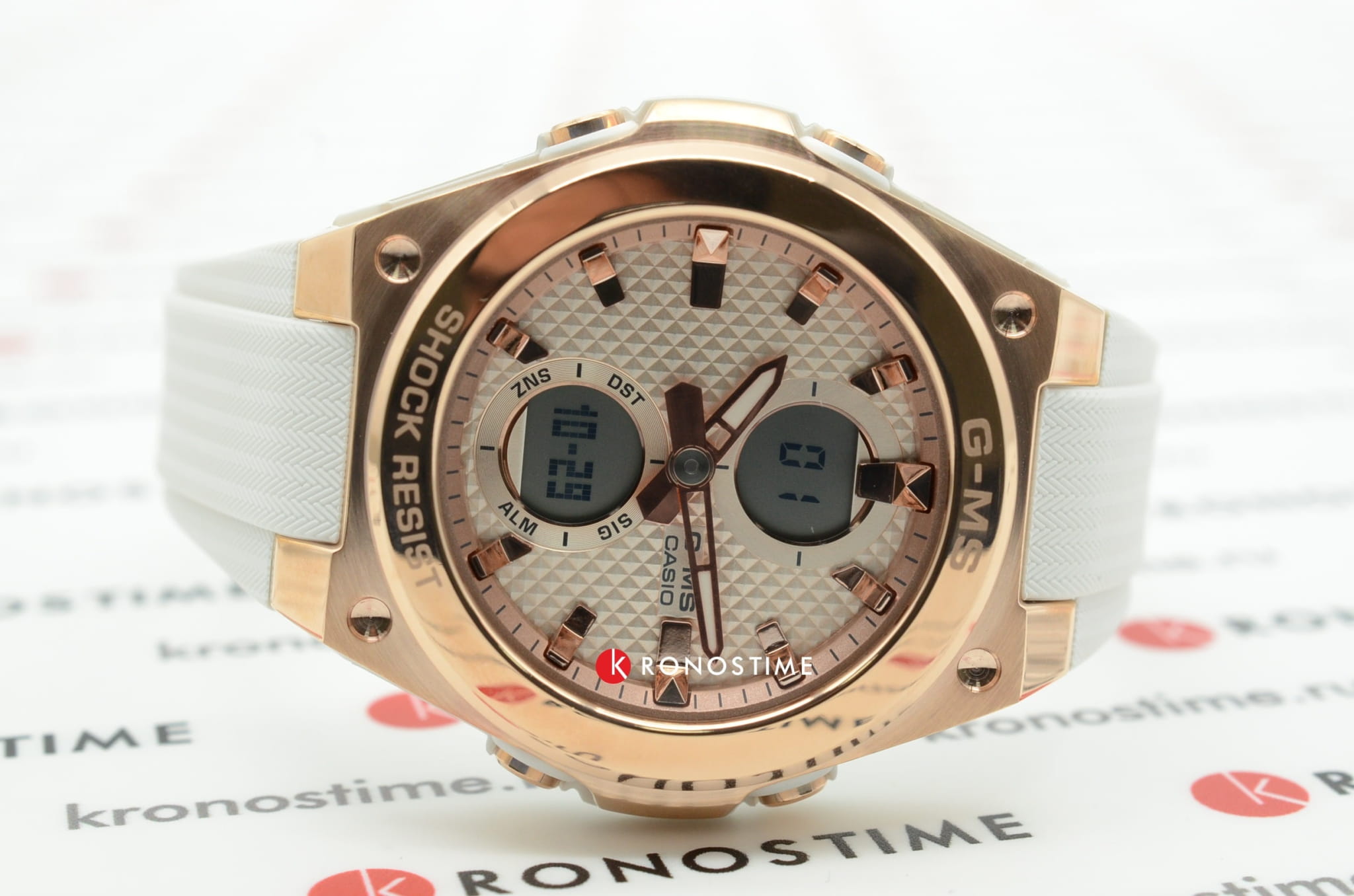 Аксессуар с белым фактурным циферблатом наделён противоударным корпусомУдаропрочный корпусМеханизм заключён в корпус, выполненный из современных материалов, устойчивых к ударам, механическим повреждениям и падению с высоты: инновационный пластик, карбон, нержавеющая сталь, титан. из полимерного пластика. Для усиления устойчивости к ударам безельБезельВнешний ободок, закрепляющий стекло. В спортивных часах так называется поворотное кольцо с делениями на циферблате, выполняет роль таймера – замеряет отрезки времени на шкале. Неподвижный безель – элемент декора. Однонаправленно вращающийся безель на дайверских часах позволяет фиксировать моменты погружения и выныривания на поверхность. сделан из хирургической стали 316L. IP-покрытиеIP-покрытиеМетод ионного напыления. Демонстрирует повышенную устойчивость к истиранию, окислению и химическим веществам. Под воздействием высокого давления и температуры около 1500°C молекулы металла надёжно соединяются с частицами корпуса часов. цвета розового золота защищает от царапин. Японский кварцевый механизм. Полимерный ремешок с узорчатой поверхностью. Минеральное стекло с закалкой. Водозащита до 10 бар. ЛюминесцентнаяЛюминесцентное покрытиеПозволяет считывать показания времени в темноте. Производители наносят на стрелки, часовые индексы, безель или поверхность циферблата светонакопительный состав, дающий холодное свечение. и светодиодная подсветкаСветодиодная подсветкаСветодиодная или LED-подсветка обеспечивает появление яркого холодного свечения за счёт LED-элементов - маленьких лампочек. Они потребляют минимальное количество энергии, чаще всего можно встретить 1 светодиод, в нижней части циферблата.. Будильник, таймер, секундомер с точностью в 1/100 секунды, хронографХронографФункция позволяет измерять отрезки времени с особой точностью: часы, минуты, секунды. Верным признаком хронографа является наличие на циферблате 3 дополнительных окошек-счётчиков., ежечасный сигнал, мировое времяМировое время Полезное часовое усложнение, отображающее время в основных городах и известных областях по всему миру, оно связано с часовыми поясами, удобно для путешественников и бизнесменов. . Габариты: 45,1 x 40,3 x 12,4 мм.