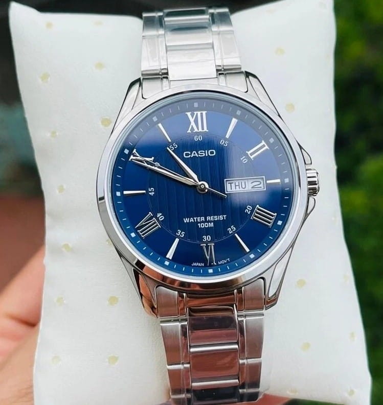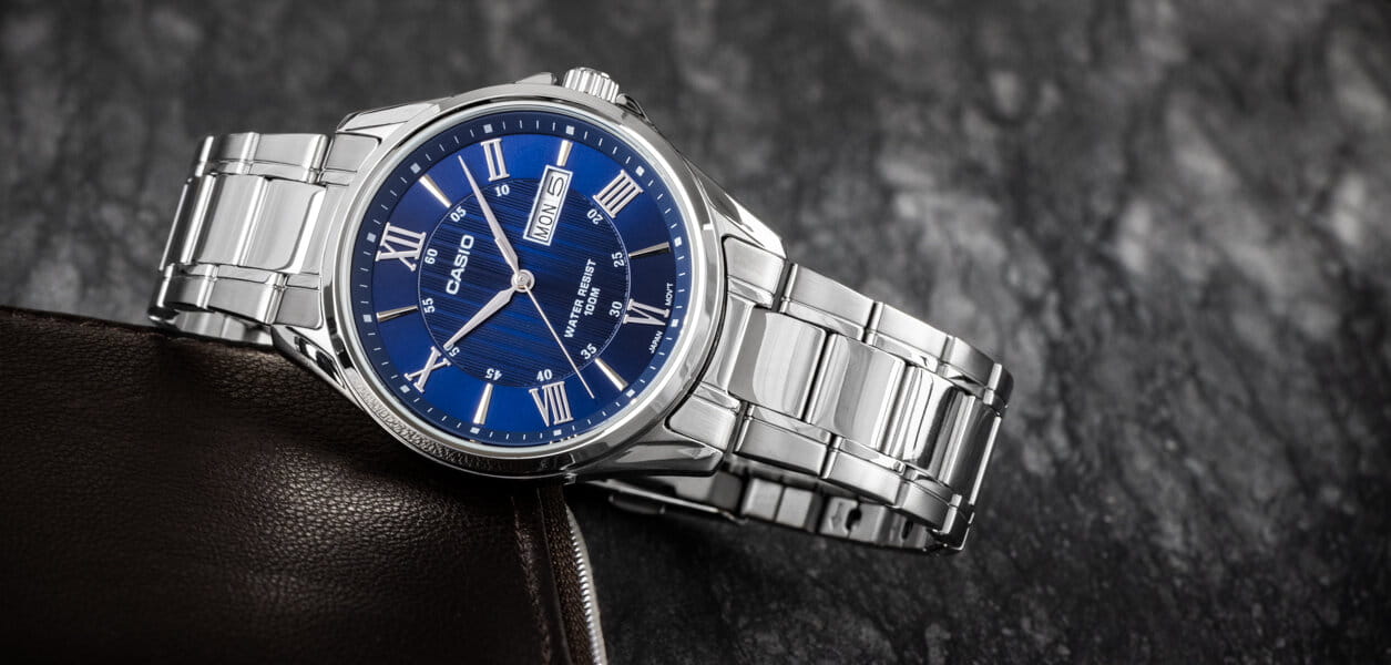 Японские мужские наручные часы с минеральным стекломМинеральное стеклоМинеральное стекло представляет собой искусственно выращенный минерал кварца. Такое стекло отличается особой устойчивостью к повреждениям и царапинам. Уступает по некоторым качествам сапфировому стеклу. Casio Collection MTP-1384D-2A, кварцевый механизм с высокой точностью. Класс водозащиты: 100 метров, позволит плавать, нырять и заниматься другими водными видами спорта. Корпус часов изготовлен из стали. Стальной браслет на раскладной застёжкеРаскладная застёжкаТакой тип застёжки используется только на браслетах из металла. Она никогда не раскрывается полностью, происходит разделение на 2 и более частей. Раскладывающая застёжка снизит вероятность потери часов к минимуму.. Окошки дня недели и даты находятся в положении 3 часа.