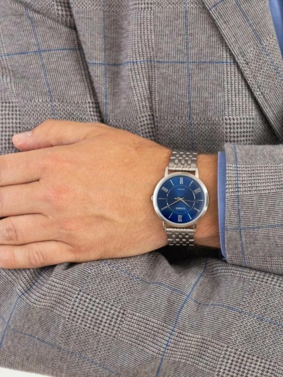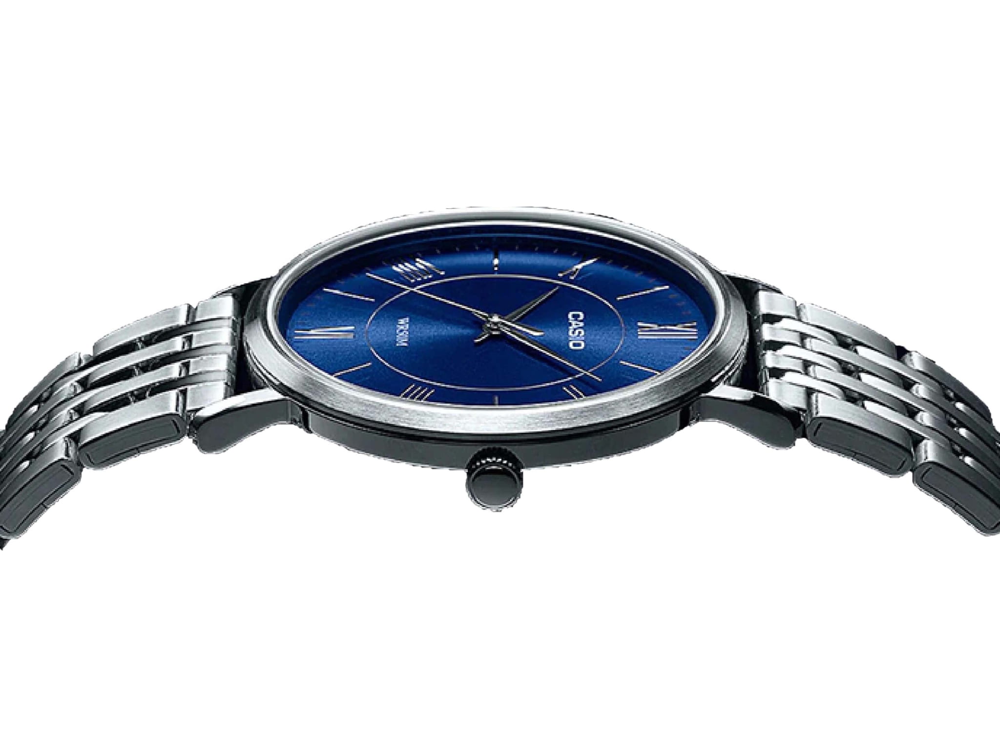 Японские мужские часы с минеральным стекломМинеральное стеклоМинеральное стекло представляет собой искусственно выращенный минерал кварца. Такое стекло отличается особой устойчивостью к повреждениям и царапинам. Уступает по некоторым качествам сапфировому стеклу. Casio Collection MTP-B110D-2A, кварцевый механизм с высокой точностью. Класс водозащиты: 50 метров, позволит защитить корпус от случайных брызг или капель дождя. Корпус и браслет часов изготовлены из стали. Браслет с раскладной застёжкойРаскладная застёжкаТакой тип застёжки используется только на браслетах из металла. Она никогда не раскрывается полностью, происходит разделение на 2 и более частей. Раскладывающая застёжка снизит вероятность потери часов к минимуму..