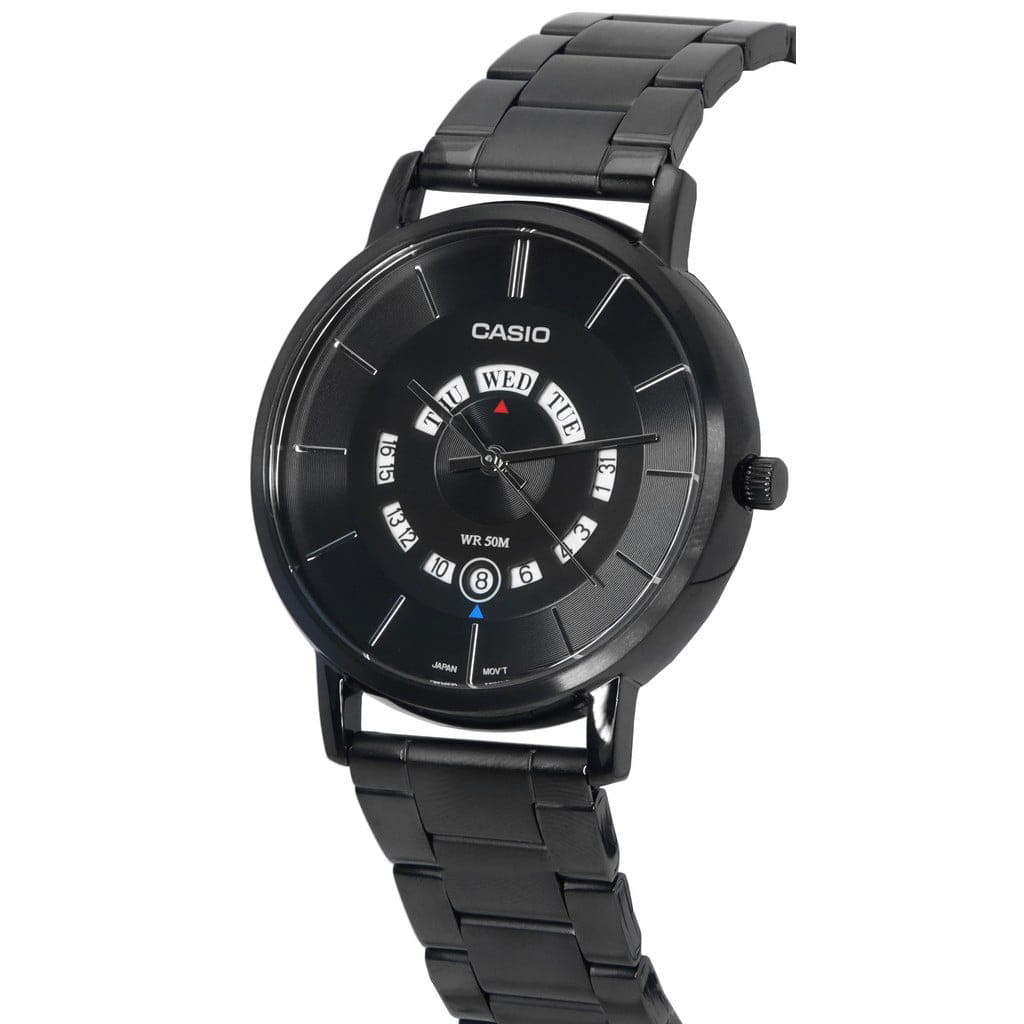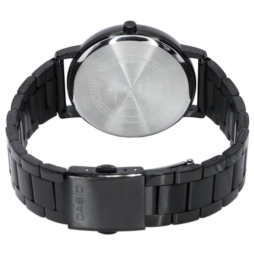 Японские мужские часы Casio Collection MTP-B135B-1A с минеральным стекломМинеральное стеклоМинеральное стекло представляет собой искусственно выращенный минерал кварца. Такое стекло отличается особой устойчивостью к повреждениям и царапинам. Уступает по некоторым качествам сапфировому стеклу. изящно смотрятся на запястье, они привлекают классическим исполнением и правильной геометрией. Минималистичная модель станет отличным решением для любого случая: на работу, переговоры с деловыми партнёрами, прогулку с друзьями или праздничный вечер. Отсутствуют лишние детали, что позволяет часам быть актуальными на долгие годы. Корпус и браслет выполнены из нержавеющей стали с IP-покрытиемIP-покрытиеМетод ионного напыления. Демонстрирует повышенную устойчивость к истиранию, окислению и химическим веществам. Под воздействием высокого давления и температуры около 1500°C молекулы металла надёжно соединяются с частицами корпуса часов.. Модель комплектуется надёжным механизмом, точность хода которого составляет +/- 20 сек/мес. Раскладная застёжкаРаскладная застёжкаТакой тип застёжки используется только на браслетах из металла. Она никогда не раскрывается полностью, происходит разделение на 2 и более частей. Раскладывающая застёжка снизит вероятность потери часов к минимуму.