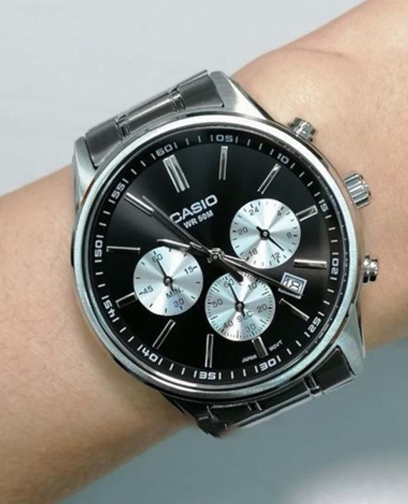 Японские мужские наручные часы с минеральным стекломМинеральное стеклоМинеральное стекло представляет собой искусственно выращенный минерал кварца. Такое стекло отличается особой устойчивостью к повреждениям и царапинам. Уступает по некоторым качествам сапфировому стеклу. Casio Collection MTP-E515D-1AVDF (MTP-E515D-1A), кварцевый механизм с высокой точностью. Класс водозащиты: 50 метров, позволит защитить корпус от случайных брызг или капель дождя. Корпус часов изготовлен из стали. Часы-хронографХронографФункция позволяет измерять отрезки времени с особой точностью: часы, минуты, секунды. Верным признаком хронографа является наличие на циферблате 3 дополнительных окошек-счётчиков. с секундомеромСекундомерСекундоме́р — прибор, способный измерять интервалы времени с точностью до долей секунды. точностью 1сек и временем измерения 30мин. 12-ти и 24-х часовой формат времени. Метки в виде штрихов. Стальной браслет на раскладной застёжкеРаскладная застёжкаТакой тип застёжки используется только на браслетах из металла. Она никогда не раскрывается полностью, происходит разделение на 2 и более частей. Раскладывающая застёжка снизит вероятность потери часов к минимуму.. Стрелки и метки с люминесцентным покрытиемЛюминесцентное покрытиеПозволяет считывать показания времени в темноте. Производители наносят на стрелки, часовые индексы, безель или поверхность циферблата светонакопительный состав, дающий холодное свечение..