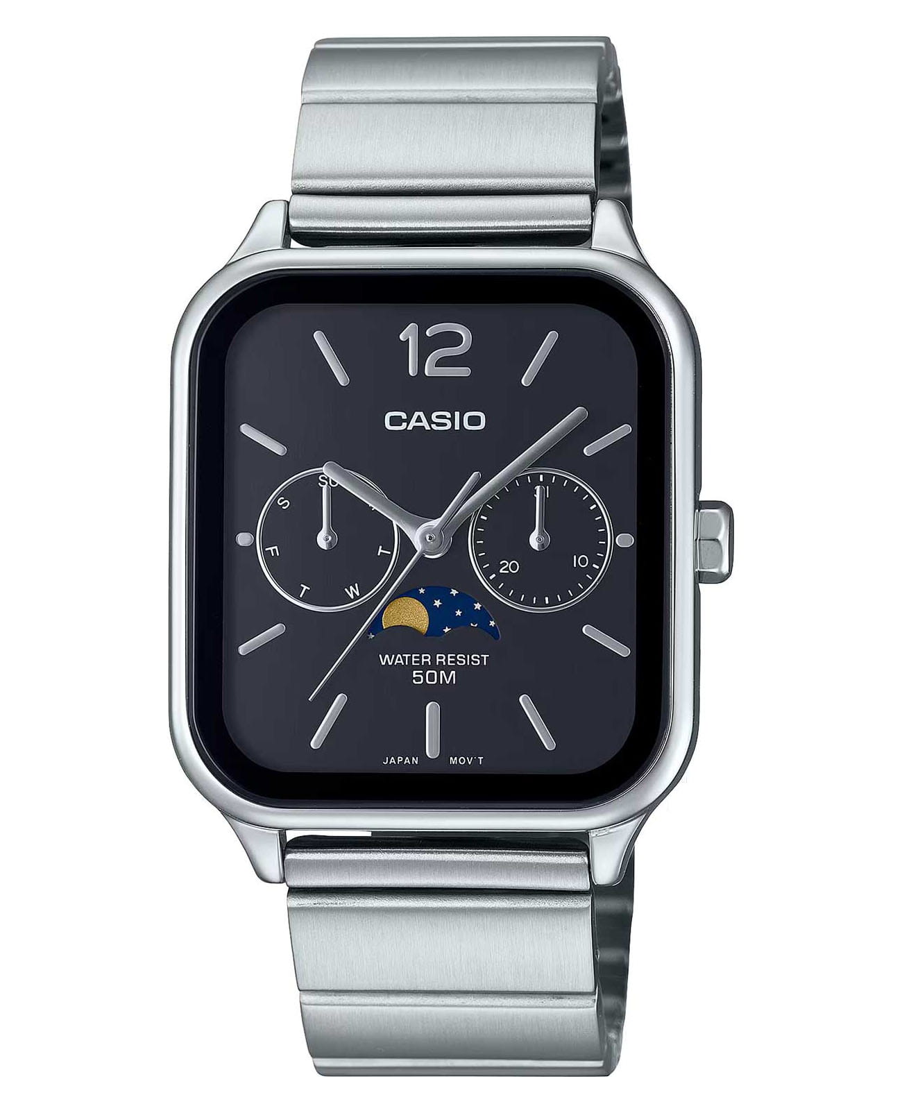 Японские мужские кварцевые часы с минеральным стекломМинеральное стеклоМинеральное стекло представляет собой искусственно выращенный минерал кварца. Такое стекло отличается особой устойчивостью к повреждениям и царапинам. Уступает по некоторым качествам сапфировому стеклу. Casio Collection MTP-M305D-1A, кварцевый механизм с высокой точностью. Корпус часов изготовлен из нержавеющей стали. Циферблат с метками в виде штрихов. Особенностью модели является наличие индикатора фазы луны над шестью часами по циферблату. Индикатор имеет 4 положения и отображается новолуние и полнолуние, а также растущую и убывающую Луну. Батарейка рассчитана на 3 года. Класс водозащиты: 50 метров, позволит защитить корпус от случайных брызг или капель дождя. Стальной браслет на раскладной застёжкеРаскладная застёжкаТакой тип застёжки используется только на браслетах из металла. Она никогда не раскрывается полностью, происходит разделение на 2 и более частей. Раскладывающая застёжка снизит вероятность потери часов к минимуму..