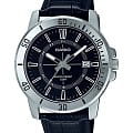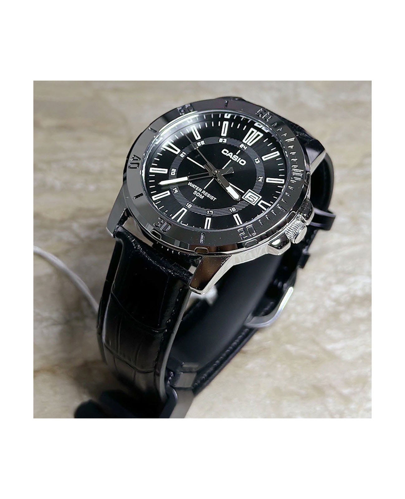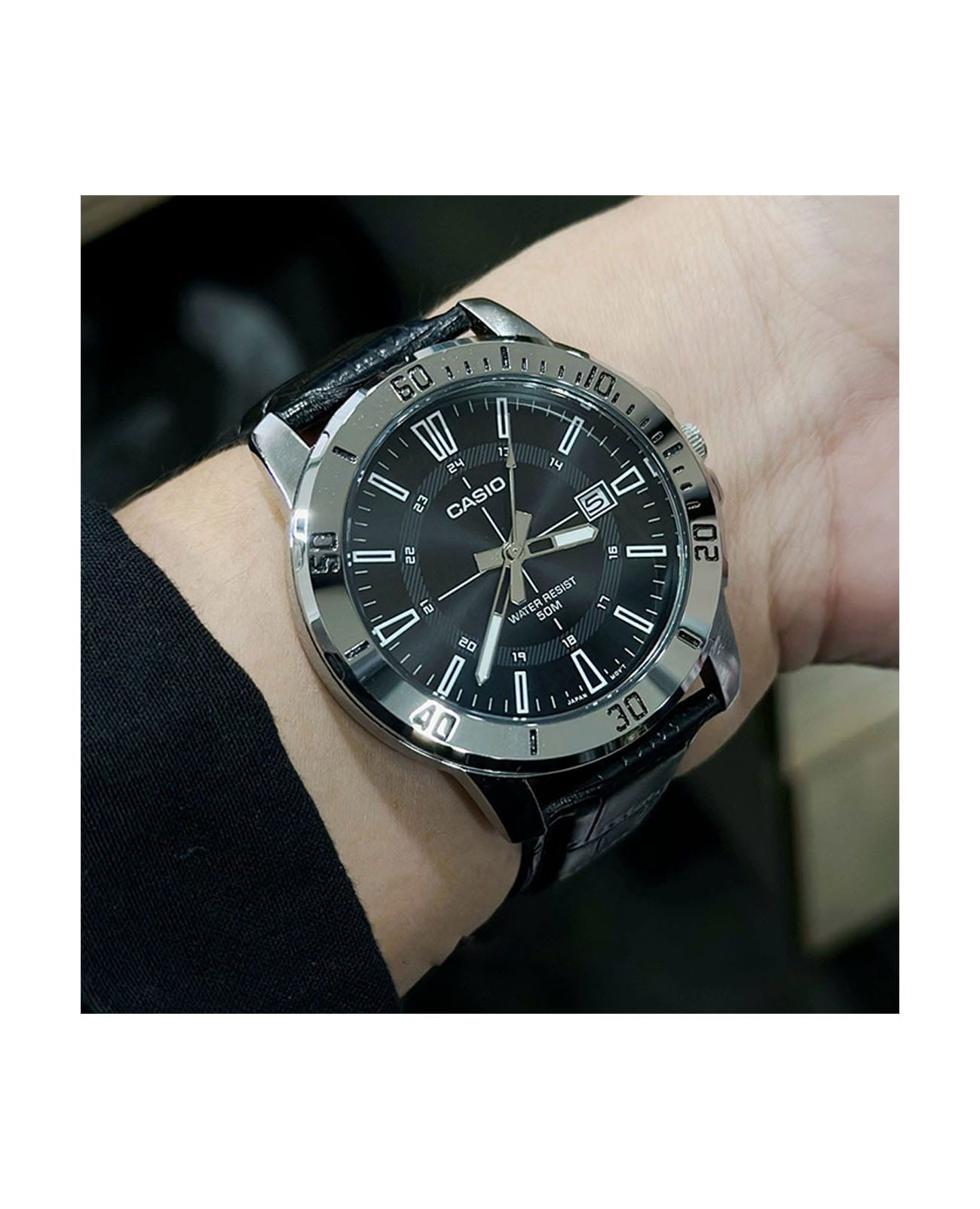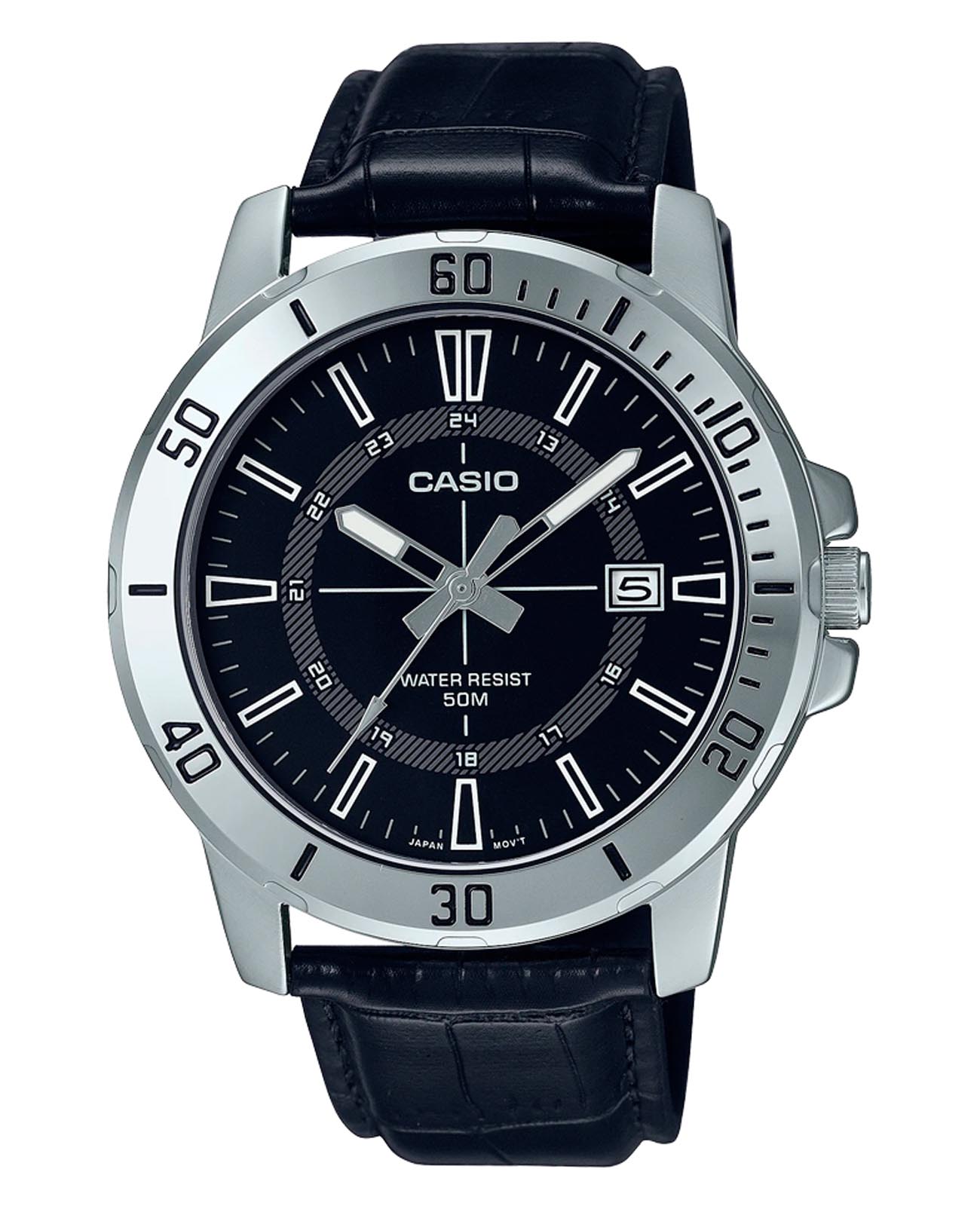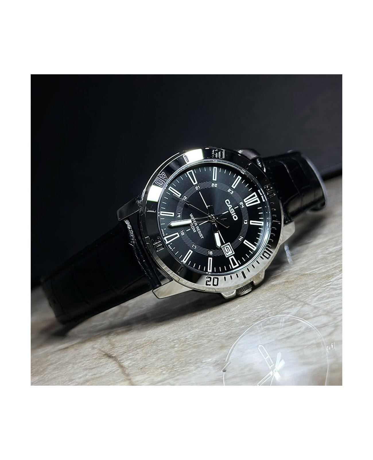 Японские мужские кварцевые часы с минеральным стекломМинеральное стеклоМинеральное стекло представляет собой искусственно выращенный минерал кварца. Такое стекло отличается особой устойчивостью к повреждениям и царапинам. Уступает по некоторым качествам сапфировому стеклу. Casio Collection MTP-VD01L-1CV, кварцевый механизм с высокой точностью. Корпус часов изготовлен из нержавеющей стали. Циферблат с метками в виде штрихов. Стрелки с люминесцентным покрытиемЛюминесцентное покрытиеПозволяет считывать показания времени в темноте. Производители наносят на стрелки, часовые индексы, безель или поверхность циферблата светонакопительный состав, дающий холодное свечение.. Окошко даты находится в положении 3 часа. Заводная головка с защитой. Батарея рассчитана на 3 года. Класс водозащиты: 50 метров, позволит защитить корпус от случайных брызг или капель дождя. Кожаный ремешок на стандартной застежке.