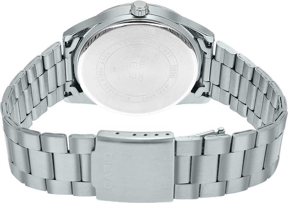 Японские мужские кварцевые часы с минеральным стекломМинеральное стеклоМинеральное стекло представляет собой искусственно выращенный минерал кварца. Такое стекло отличается особой устойчивостью к повреждениям и царапинам. Уступает по некоторым качествам сапфировому стеклу. Casio Collection MTP-VD03D-3A1UDF, кварцевый механизм с высокой точностью. Корпус часов изготовлен из нержавеющей стали. 12-ти и 24-х часовой формат времени. Циферблат с метками в виде штрихов. Стрелки с люминесцентным покрытиемЛюминесцентное покрытиеПозволяет считывать показания времени в темноте. Производители наносят на стрелки, часовые индексы, безель или поверхность циферблата светонакопительный состав, дающий холодное свечение.. Окошко даты находится в положении 3 часов. Батарея рассчитана на 3 года. Класс водозащиты: 50 метров, позволит защитить корпус от случайных брызг или капель дождя. Стальной браслет на раскладной застёжкеРаскладная застёжкаТакой тип застёжки используется только на браслетах из металла. Она никогда не раскрывается полностью, происходит разделение на 2 и более частей. Раскладывающая застёжка снизит вероятность потери часов к минимуму..