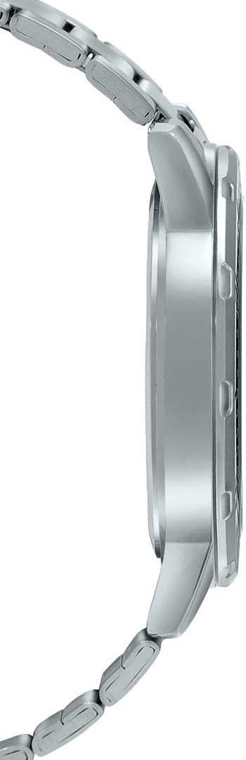 Кварцевый механизм с высокой точностью. Минеральное стеклоМинеральное стеклоМинеральное стекло представляет собой искусственно выращенный минерал кварца. Такое стекло отличается особой устойчивостью к повреждениям и царапинам. Уступает по некоторым качествам сапфировому стеклу. устойчивое к появлению царапин, обладающее высокой прозрачностью. Стрелки с люминесцентным покрытиемЛюминесцентное покрытиеПозволяет считывать показания времени в темноте. Производители наносят на стрелки, часовые индексы, безель или поверхность циферблата светонакопительный состав, дающий холодное свечение.. Класс водозащиты: 20 метров, позволит защитить корпус от случайных брызг или капель дождя. Корпус часов изготовлен из нержавеющей стали. Браслет с раскладной застёжкойРаскладная застёжкаТакой тип застёжки используется только на браслетах из металла. Она никогда не раскрывается полностью, происходит разделение на 2 и более частей. Раскладывающая застёжка снизит вероятность потери часов к минимуму..