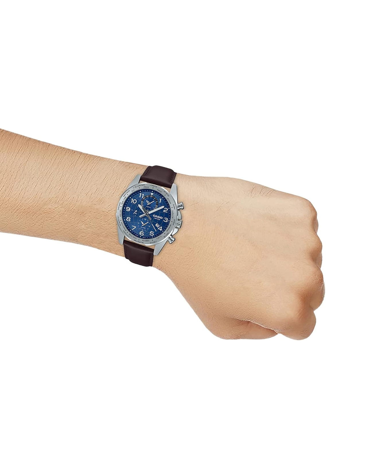 Японские мужские часы-хронографХронографФункция позволяет измерять отрезки времени с особой точностью: часы, минуты, секунды. Верным признаком хронографа является наличие на циферблате 3 дополнительных окошек-счётчиков. с секундомеромСекундомерСекундоме́р — прибор, способный измерять интервалы времени с точностью до долей секунды. Casio Collection MTP-W500L-2A, кварцевый механизм с высокой точностью. Класс водозащиты: 50 метров, позволит защитить корпус от случайных брызг или капель дождя. Корпус и браслет часов изготовлены из стали. Удобное отображение времени домашнего часового пояса и мирового времениМировое время Полезное часовое усложнение, отображающее время в основных городах и известных областях по всему миру, оно связано с часовыми поясами, удобно для путешественников и бизнесменов. (24 города - 24 зоны) позволяет ориентироваться при путешествиях. Кожаный ремешок на стандартной застёжке. БудильникБудильникБуди́льник — часы, в заданный момент времени подающие звуковой, световой и/или в редких случаях другой сигнал./ежечасный сигнал. Минеральное стеклоМинеральное стеклоМинеральное стекло представляет собой искусственно выращенный минерал кварца. Такое стекло отличается особой устойчивостью к повреждениям и царапинам. Уступает по некоторым качествам сапфировому стеклу. устойчивое к мелким механическим повреждениям. Центральные часовая, минутная и секундная стрелки. Индикатор низкого заряда батареи. Синий циферблат с часовыми индексами в виде штрихов и цифр. Стрелки и метки с люминесцентным покрытиемЛюминесцентное покрытиеПозволяет считывать показания времени в темноте. Производители наносят на стрелки, часовые индексы, безель или поверхность циферблата светонакопительный состав, дающий холодное свечение..