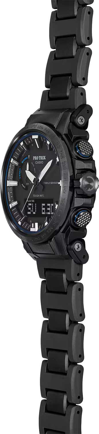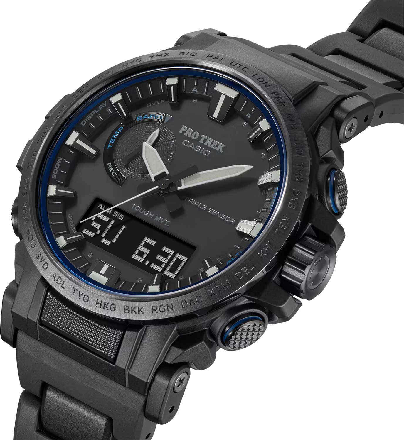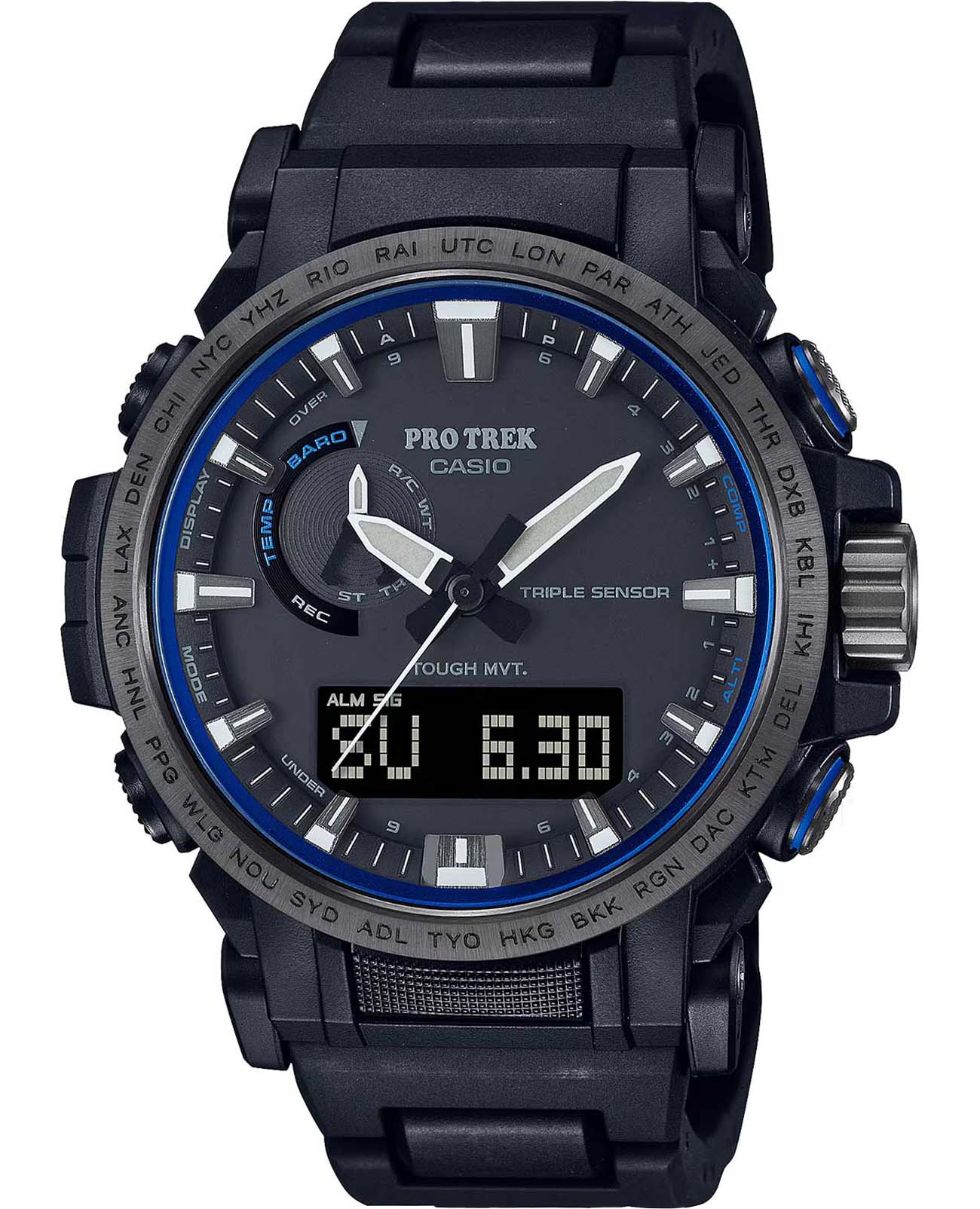 Флагманский аксессуар с аналого-цифровым дисплеем. Ни одна туристическая вылазка не обойдётся без этих часов, ведь они оснащены барометром, термометром -10°C /+60°C, альтиметром, цифровым компасом, хронографомХронографФункция позволяет измерять отрезки времени с особой точностью: часы, минуты, секунды. Верным признаком хронографа является наличие на циферблате 3 дополнительных окошек-счётчиков., таймером, функцией мирового времениМировое время Полезное часовое усложнение, отображающее время в основных городах и известных областях по всему миру, оно связано с часовыми поясами, удобно для путешественников и бизнесменов. – 29 часовых поясов и UTCUTCВсемирное кординационное время, не имеющее привязки к географическому положению Гринвича, основывается на атомном отсчёте времени. Регулировка времени осуществляется более точно, чем устаревшее GMT.