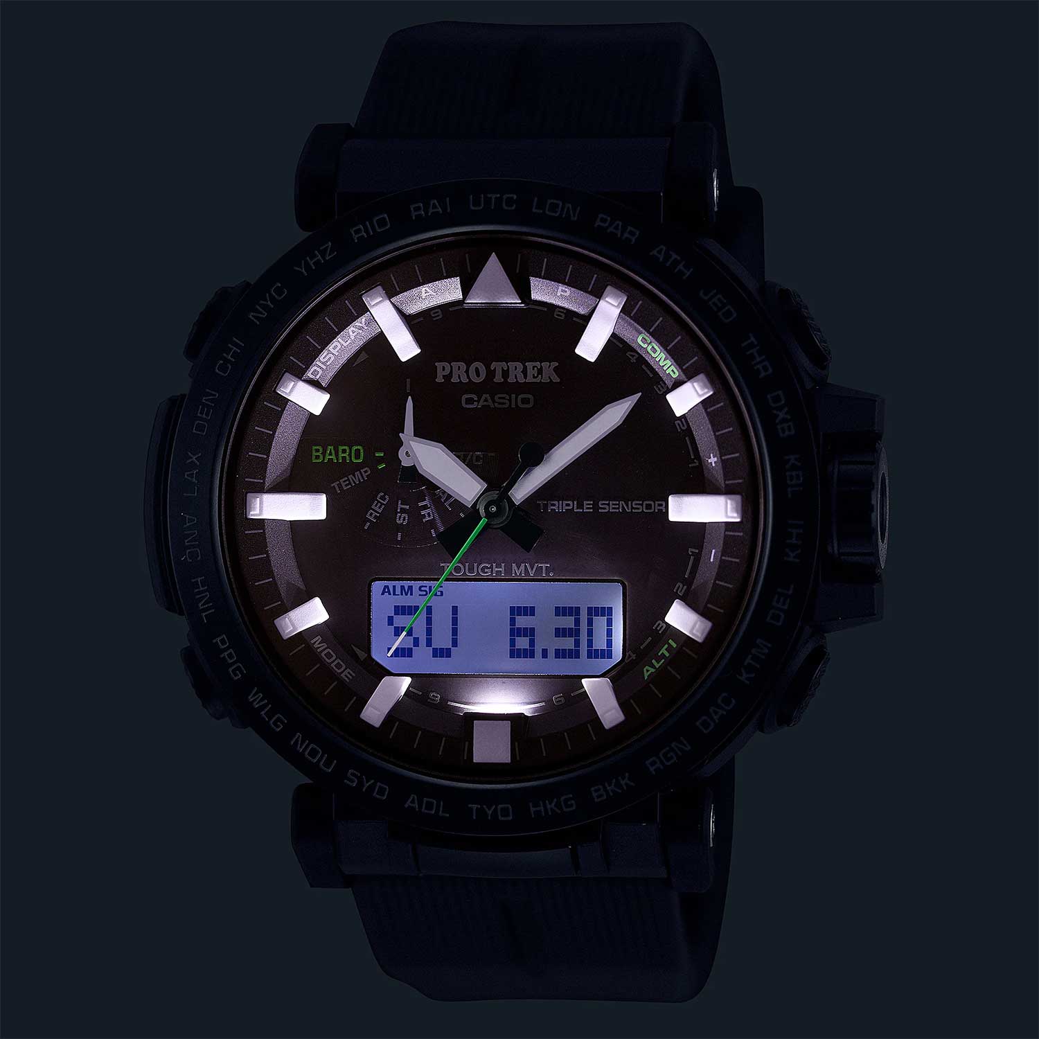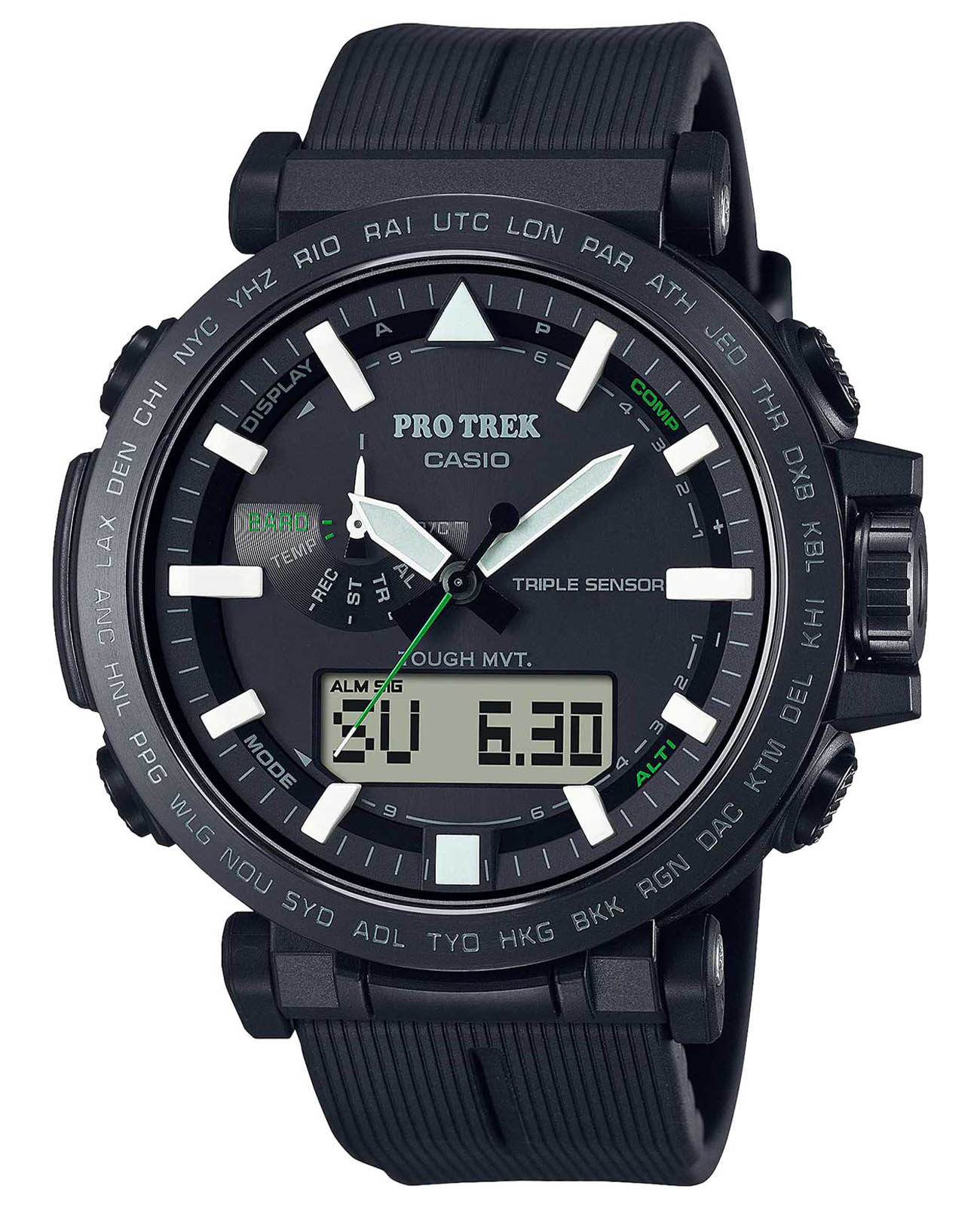 Мужские японские наручные часы на солнечной батарее Casio Pro Trek PRW-6621Y-1ER, кварцевый механизм с высокой точностью. Корпус выполнен из высококачественного пластика со вставками стали с IP-покрытиемIP-покрытиеМетод ионного напыления. Демонстрирует повышенную устойчивость к истиранию, окислению и химическим веществам. Под воздействием высокого давления и температуры около 1500°C молекулы металла надёжно соединяются с частицами корпуса часов.. Класс водозащиты: 100 метров, позволит плавать, нырять и заниматься другими водными видами спорта. Технология Tough SolarTough SolarТехнология основана на подзарядке аккумулятора от источника солнечного света, специальная панель улавливает солнечные лучи и преобразует их в энергию для работы часов. Достаточно пары минут нахождения на солнце для функционирования часов в течении суток.. Автоматическая подсветка при наклоне часов в сторону лица. СекундомерСекундомерСекундоме́р — прибор, способный измерять интервалы времени с точностью до долей секунды., сплит-хронографСплит-хронографИспользуется для измерения продолжительности нескольких временных отрезков, начинающихся одновременно, а заканчивающихся в разное время., таймерТаймерОтсчитывает секунды в обратном направлении в заданном интервале времени., мировое времяМировое время Полезное часовое усложнение, отображающее время в основных городах и известных областях по всему миру, оно связано с часовыми поясами, удобно для путешественников и бизнесменов. 29 часовых поясов, всемирное координированное время. Встроенный цифровой компас измеряет и отображает направление в виде одной из 16 точек. Диапазон измерения от 0° до 359° с разрешением 1°. Стрелочная индикация севера. Коррекция магнитного склонения. Высотомер - встроенный датчик барометрического давления с возможностью вывода результатов в единицах высоты над уровнем моря (от -700 до 10000 метров). Термометр от -10° до +60°С.