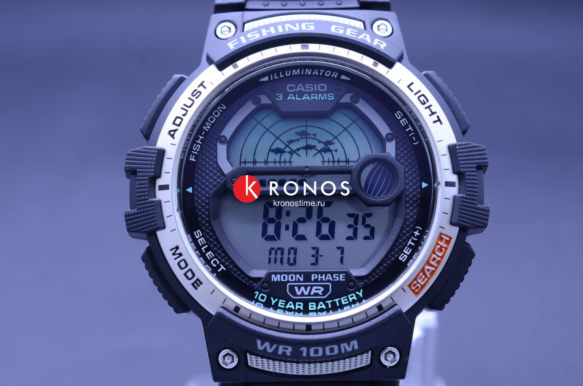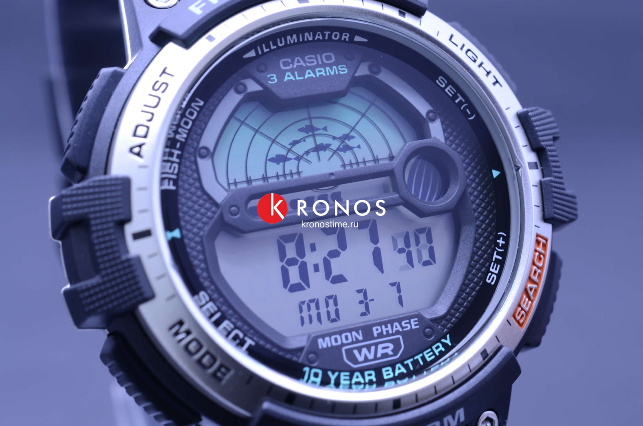 Наручные часы с брутальным дизайном надёжно крепятся на запястье благодаря полимерному ремешку. Материал отличается надёжностью, обеспечивает комфорт при ношении. Дисплей в верней части представляет собой индикатор рыбалки. Появление пиктограмм в виде рыбок обозначает, что наступило благоприятное время для клёва. Этому дополнительно способствует и индикатор фаз луны. Японский кварцевый механизм получает питание от батарейки, эксплуатационный срок которой составляет 10 лет. Органическое стекло не разобьётся в случае падения. Водонепроницаемость 100 метров. Светодиодная подсветкаСветодиодная подсветкаСветодиодная или LED-подсветка обеспечивает появление яркого холодного свечения за счёт LED-элементов - маленьких лампочек. Они потребляют минимальное количество энергии, чаще всего можно встретить 1 светодиод, в нижней части циферблата. циферблата. Мировое времяМировое время Полезное часовое усложнение, отображающее время в основных городах и известных областях по всему миру, оно связано с часовыми поясами, удобно для путешественников и бизнесменов. . Будильник, хронографХронографФункция позволяет измерять отрезки времени с особой точностью: часы, минуты, секунды. Верным признаком хронографа является наличие на циферблате 3 дополнительных окошек-счётчиков., таймер, вечный календарьВечный календарьКлассическое часовое усложнение, представляющее собой календарь, рассчитанный на несколько лет вперёд (стандартно – до 2099 года). Определяет текущую дату, день недели, месяц., секундомер. Габариты: 46,6 x 48,6 x 13,5 мм.