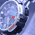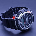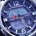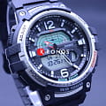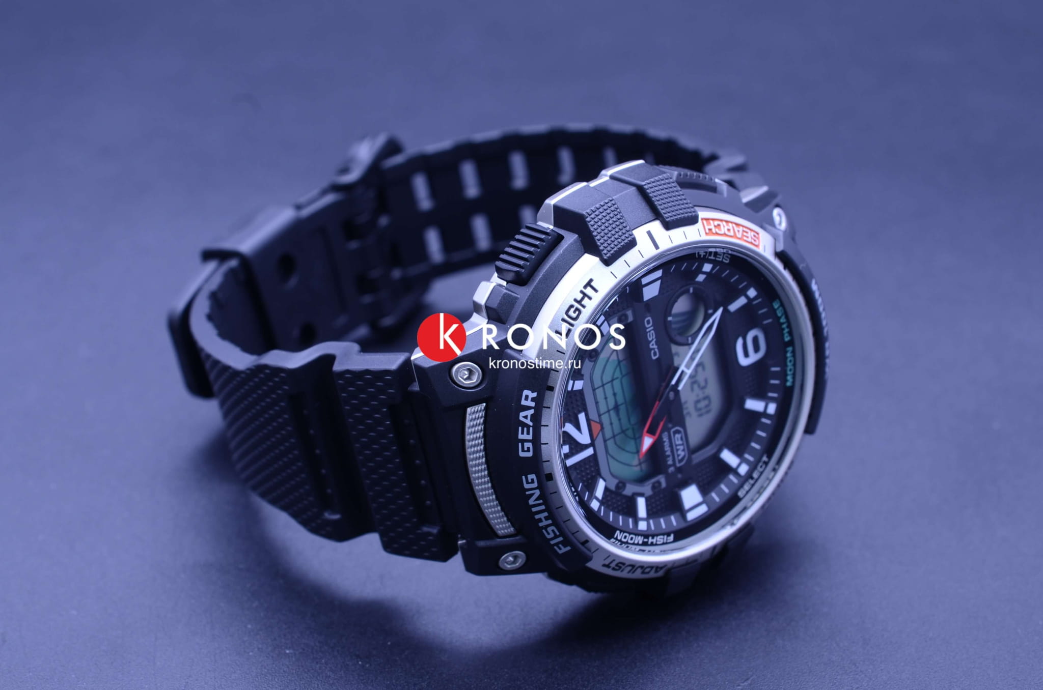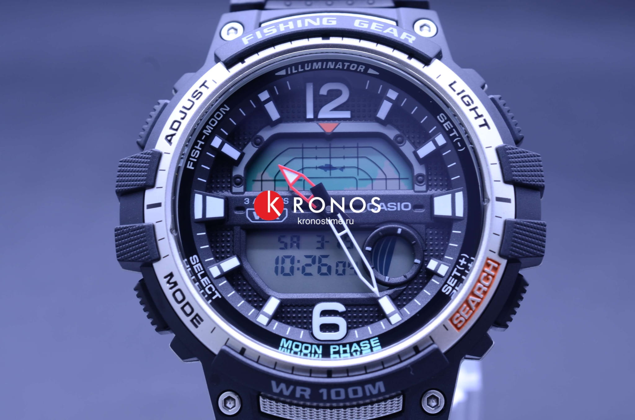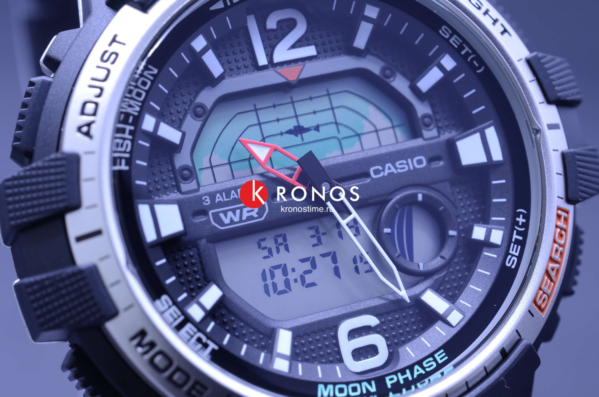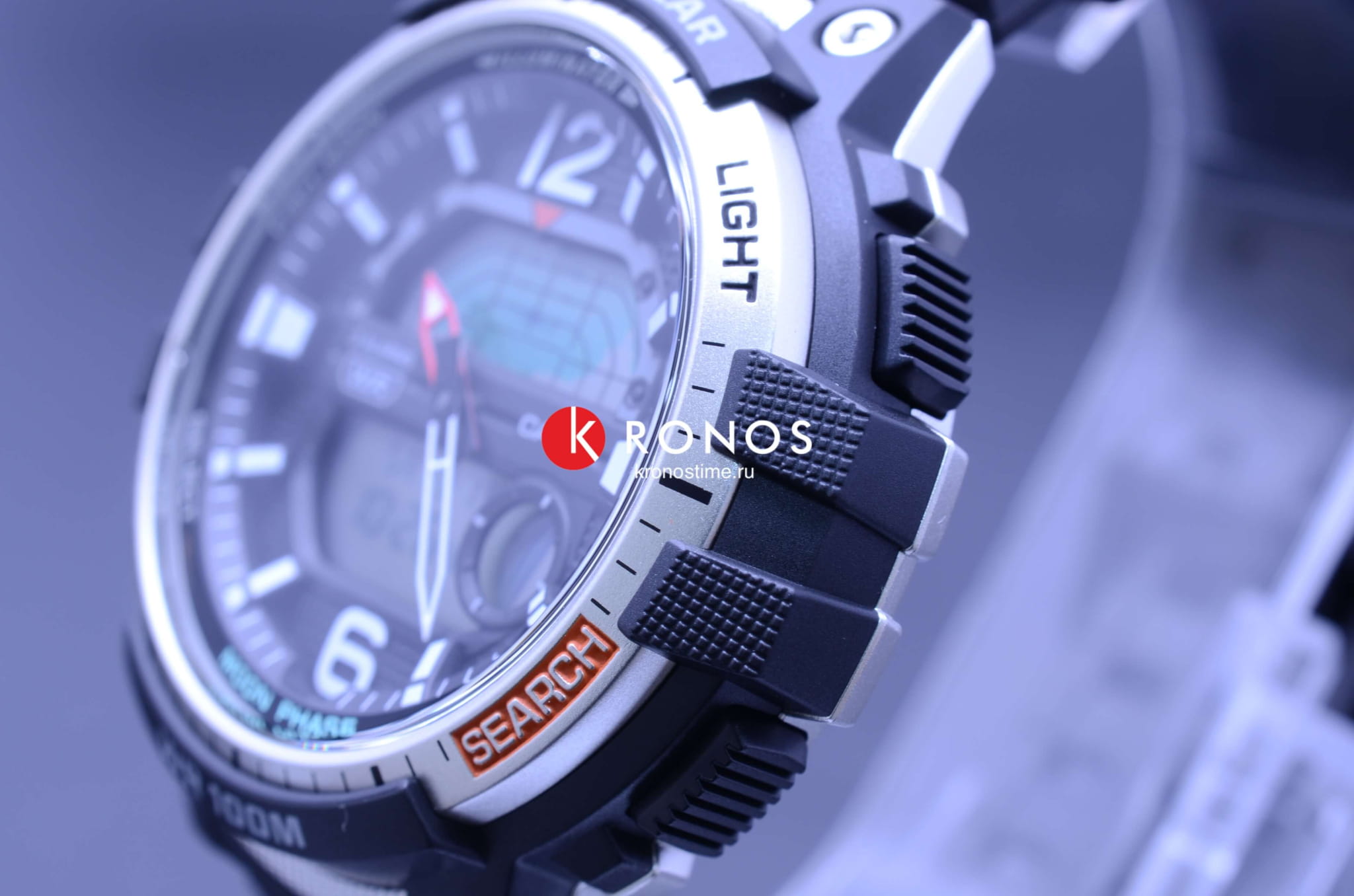 Аксессуар представлен в спортивном стиле. Чёрный полимерный ремешок имеет протекторную поверхность, боковые кнопки рифленые. В верхней части циферблата расположился индикатор рыбалки. Устройство поможет чётко рассчитать благоприятное время для рыбной ловли, в этот момент на экране появятся символы в виде рыбок. Корпус выполнен из полимерного пластика, материал устойчив к ударам, повреждениям. Японский кварцевый механизм. Батарейка рассчитана на 3 года работы. Акриловое стекло не повреждается при падении. Циферблат с оранжевой светодиодной подсветкойСветодиодная подсветкаСветодиодная или LED-подсветка обеспечивает появление яркого холодного свечения за счёт LED-элементов - маленьких лампочек. Они потребляют минимальное количество энергии, чаще всего можно встретить 1 светодиод, в нижней части циферблата.. Класс водостойкости WR 100. Отображение мирового времениМировое время Полезное часовое усложнение, отображающее время в основных городах и известных областях по всему миру, оно связано с часовыми поясами, удобно для путешественников и бизнесменов. . Будильник с функцией повтора, отображение лунных фаз, хронографХронографФункция позволяет измерять отрезки времени с особой точностью: часы, минуты, секунды. Верным признаком хронографа является наличие на циферблате 3 дополнительных окошек-счётчиков., таймер, вечный календарьВечный календарьКлассическое часовое усложнение, представляющее собой календарь, рассчитанный на несколько лет вперёд (стандартно – до 2099 года). Определяет текущую дату, день недели, месяц.. Габариты: 47,9 x 48,6 x 14 мм.