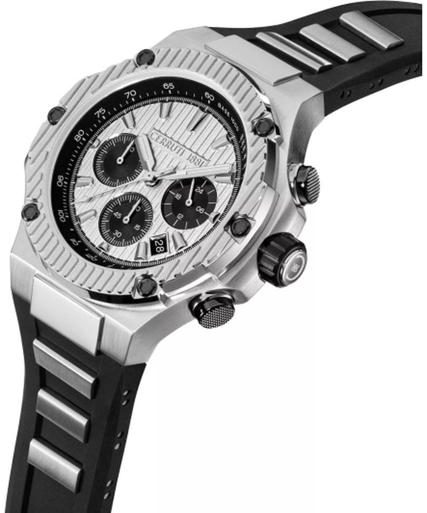 Cerruti 1881 CIWGO0050604 — выразительные мужские часы с современным архитектурным дизайном, сочетающие спортивную мощь и итальянскую утончённость. Корпус из нержавеющей стали с фактурным шестигранным безелемБезельВнешний ободок, закрепляющий стекло. В спортивных часах так называется поворотное кольцо с делениями на циферблате, выполняет роль таймера – замеряет отрезки времени на шкале. Неподвижный безель – элемент декора. Однонаправленно вращающийся безель на дайверских часах позволяет фиксировать моменты погружения и выныривания на поверхность. подчёркивает индустриальный характер модели, а насыщенный циферблат с тремя счётчиками хронографаХронографФункция позволяет измерять отрезки времени с особой точностью: часы, минуты, секунды. Верным признаком хронографа является наличие на циферблате 3 дополнительных окошек-счётчиков. создаёт динамичную композицию. Контрастные стрелки и метки с люминесцентным покрытиемЛюминесцентное покрытиеПозволяет считывать показания времени в темноте. Производители наносят на стрелки, часовые индексы, безель или поверхность циферблата светонакопительный состав, дающий холодное свечение. обеспечивают превосходную читаемость, а прочное минеральное стеклоМинеральное стеклоМинеральное стекло представляет собой искусственно выращенный минерал кварца. Такое стекло отличается особой устойчивостью к повреждениям и царапинам. Уступает по некоторым качествам сапфировому стеклу. надёжно защищает циферблат. Мягкий силиконовый ремешок с интегрированным дизайном гармонирует с цветовой палитрой корпуса и обеспечивает комфортное прилегание к запястью. Cerruti 1881 — это стильный союз технологий, функциональности и узнаваемого итальянского характера, идеально подходящий для активного и уверенного мужчины.