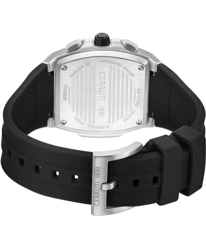 Cerruti 1881 CIWGO0085001 — эффектные мужские часы, сочетающие индустриальную мощь и современную элегантность. Корпус из нержавеющей стали с массивным восьмигранным безелемБезельВнешний ободок, закрепляющий стекло. В спортивных часах так называется поворотное кольцо с делениями на циферблате, выполняет роль таймера – замеряет отрезки времени на шкале. Неподвижный безель – элемент декора. Однонаправленно вращающийся безель на дайверских часах позволяет фиксировать моменты погружения и выныривания на поверхность. и декоративными винтами подчёркивает силу и характер дизайна. Глубокий чёрный циферблат с тремя счётчиками хронографаХронографФункция позволяет измерять отрезки времени с особой точностью: часы, минуты, секунды. Верным признаком хронографа является наличие на циферблате 3 дополнительных окошек-счётчиков. и рельефной текстурой придаёт модели динамичность, а контрастные стрелки и метки с люминесцентным покрытиемЛюминесцентное покрытиеПозволяет считывать показания времени в темноте. Производители наносят на стрелки, часовые индексы, безель или поверхность циферблата светонакопительный состав, дающий холодное свечение. обеспечивают превосходную читаемость при любом освещении. Прочное минеральное стеклоМинеральное стеклоМинеральное стекло представляет собой искусственно выращенный минерал кварца. Такое стекло отличается особой устойчивостью к повреждениям и царапинам. Уступает по некоторым качествам сапфировому стеклу. защищает циферблат от царапин, а мягкий каучуковый ремешок обеспечивает комфорт при ежедневном ношении. Cerruti 1881 — это воплощение итальянского стиля, надёжности и уверенности, идеально подходящее для мужчин, ценящих современные формы и функциональную эстетику.