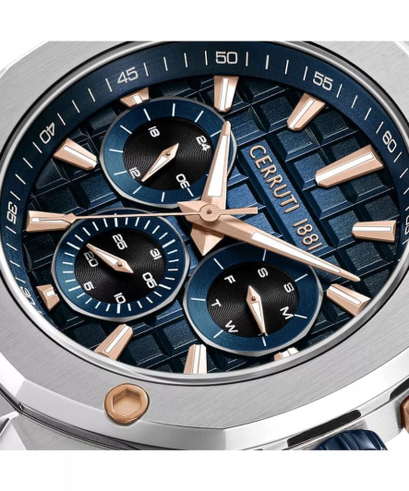 Cerruti 1881 CIWGQ0073402 — стильные мужские часы с выразительным индустриальным дизайном, в которых сочетаются спортивная энергия и итальянская элегантность. Корпус из нержавеющей стали с массивным безелемБезельВнешний ободок, закрепляющий стекло. В спортивных часах так называется поворотное кольцо с делениями на циферблате, выполняет роль таймера – замеряет отрезки времени на шкале. Неподвижный безель – элемент декора. Однонаправленно вращающийся безель на дайверских часах позволяет фиксировать моменты погружения и выныривания на поверхность. и декоративными винтами придаёт модели мощный и мужественный облик. Глубокий циферблат с тремя счётчиками хронографаХронографФункция позволяет измерять отрезки времени с особой точностью: часы, минуты, секунды. Верным признаком хронографа является наличие на циферблате 3 дополнительных окошек-счётчиков. подчёркивает технический характер часов, а контрастные стрелки и метки с люминесцентным покрытиемЛюминесцентное покрытиеПозволяет считывать показания времени в темноте. Производители наносят на стрелки, часовые индексы, безель или поверхность циферблата светонакопительный состав, дающий холодное свечение. обеспечивают отличную читаемость при любом освещении. Прочное минеральное стеклоМинеральное стеклоМинеральное стекло представляет собой искусственно выращенный минерал кварца. Такое стекло отличается особой устойчивостью к повреждениям и царапинам. Уступает по некоторым качествам сапфировому стеклу. защищает циферблат от царапин, а эластичный силиконовый ремешок гарантирует комфорт при повседневном ношении. Cerruti 1881 — гармоничное сочетание функциональности, надёжности и узнаваемого итальянского стиля, идеально подходящее для активных и уверенных мужчин.