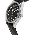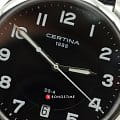 Классический циферблат чёрного цвета дополнен серебристыми стрелками, метками и арабскими цифрами, ярко выделяющимися на тёмном фоне. Ремешок из натуральной кожи с тиснением, имитирующим кожу крокодила, позволит привнести в образ нотки элегантности. Кварцевый калибр ETA E64.111. Антибликовое покрытие сапфирового стекла. Надёжный корпус из нержавеющей стали 316L. Яркая люминесцентная подсветкаЛюминесцентное покрытиеПозволяет считывать показания времени в темноте. Производители наносят на стрелки, часовые индексы, безель или поверхность циферблата светонакопительный состав, дающий холодное свечение.. Концепция ударопрочности DS Concept DS ConceptDouble Security Concept, обозначает двойную надёжность и безупречную точность часов Certina. Двойная система защиты подразумевает обеспечение максимальной устойчивости к ударам и высоких показателей водонепроницаемости.. Водостойкость 100 метров. Апертура даты, индикатор EOLEOLПредставляет собой систему, уведомляющую владельца часов о необходимости замены элемента питания. За 2 недели до полного разряда батарейки секундная стрелка перестаёт ходить чётко и начинает перепрыгивать на 3-4 деления.. Диаметр корпуса: 37 мм.
