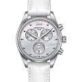 Женские швейцарские часы Certina DS-8 Lady Chronograph C033.234.36.048.01 из коллекции DS-8 – идеальное дополнение образа. Высокая точность хода швейцарского кварцевого калибра ETA G15.212 AA Precidrive™Precidrive™Инновационный кварцевый механизм Certina. Часы, оснащённые этим швейцарским калибром, приравниваются к точности к сертифицированным хронометрам, точность хода составляет +/-10 секунд в год. отмечена сертификатом COSCСертификат COSCОфициальный сертификат, подтверждающий то, что часы ходят с особо высокой точностью. Для получения документа часы подвергаются тестовым испытаниям, разработанным швейцарским институтом тестирования хронометров COSC. Допустимая норма для механических часов -4/+6 секунд в день, для кварцевых моделей +/- 0,07 секунд в день.. Сапфировое стеклоСапфировое стеклоПрочный и надёжный материал из кристалла сапфира синтетического происхождения, характеризующийся особой твёрдостью и устойчивостью к царапинам и повреждениям. с покрытием «антиблик». ХронографХронографФункция позволяет измерять отрезки времени с особой точностью: часы, минуты, секунды. Верным признаком хронографа является наличие на циферблате 3 дополнительных окошек-счётчиков., секундомер, дата, EOLEOLПредставляет собой систему, уведомляющую владельца часов о необходимости замены элемента питания. За 2 недели до полного разряда батарейки секундная стрелка перестаёт ходить чётко и начинает перепрыгивать на 3-4 деления.. Концепция Двойной Надёжности DSDS ConceptDouble Security Concept, обозначает двойную надёжность и безупречную точность часов Certina. Двойная система защиты подразумевает обеспечение максимальной устойчивости к ударам и высоких показателей водонепроницаемости.. Белый ремешок из натуральной кожи. Производство и сборка: Швейцария.
