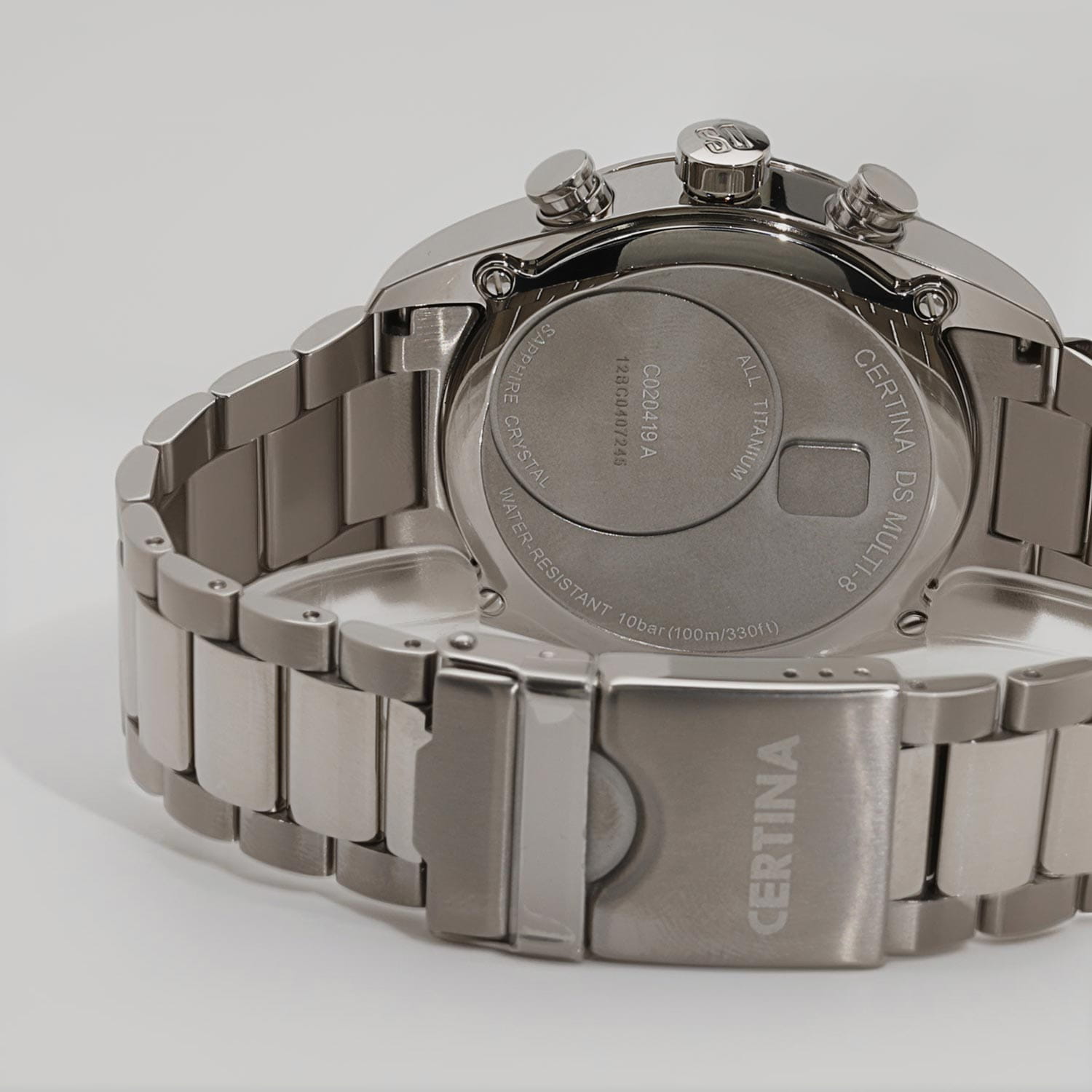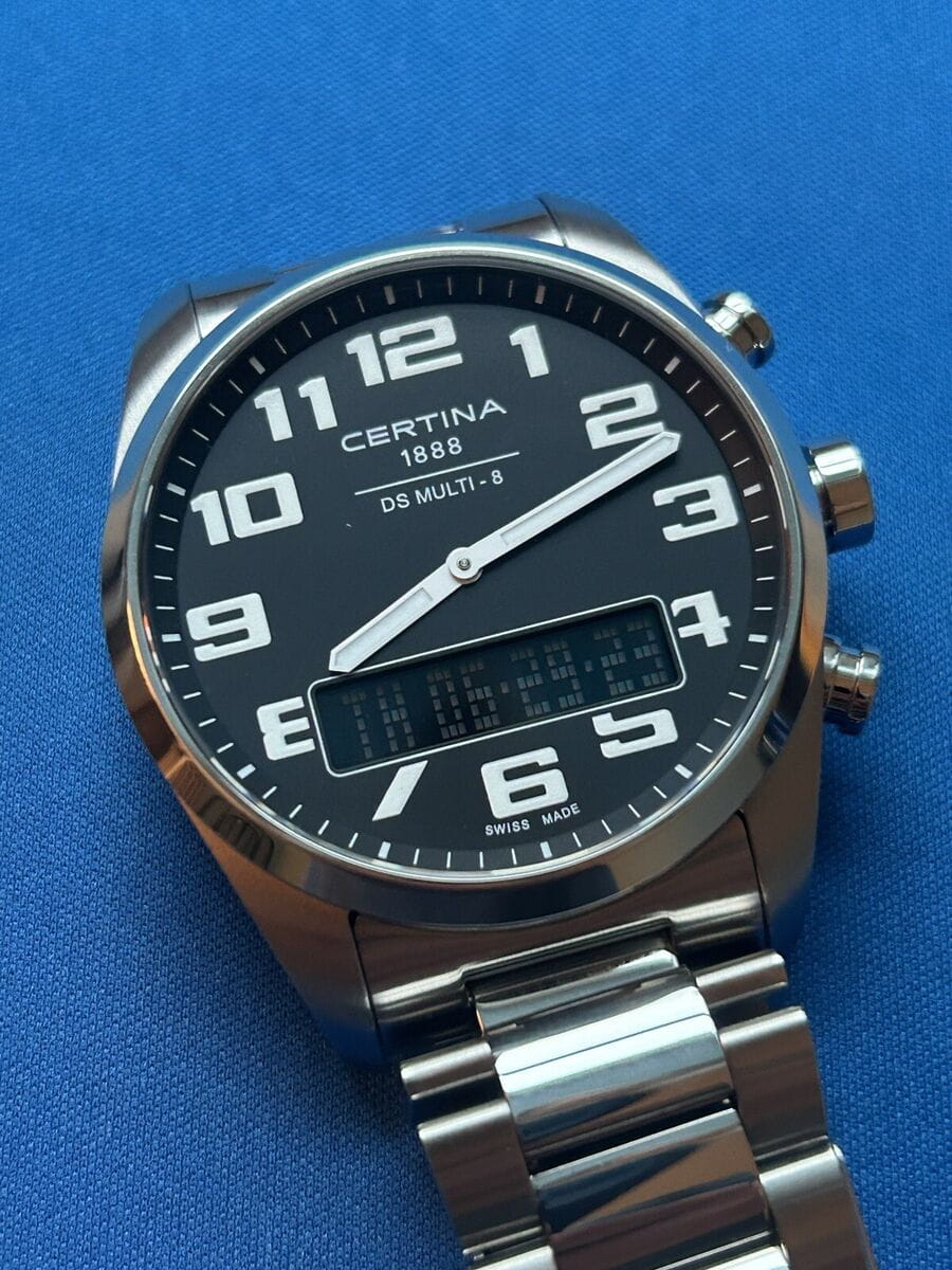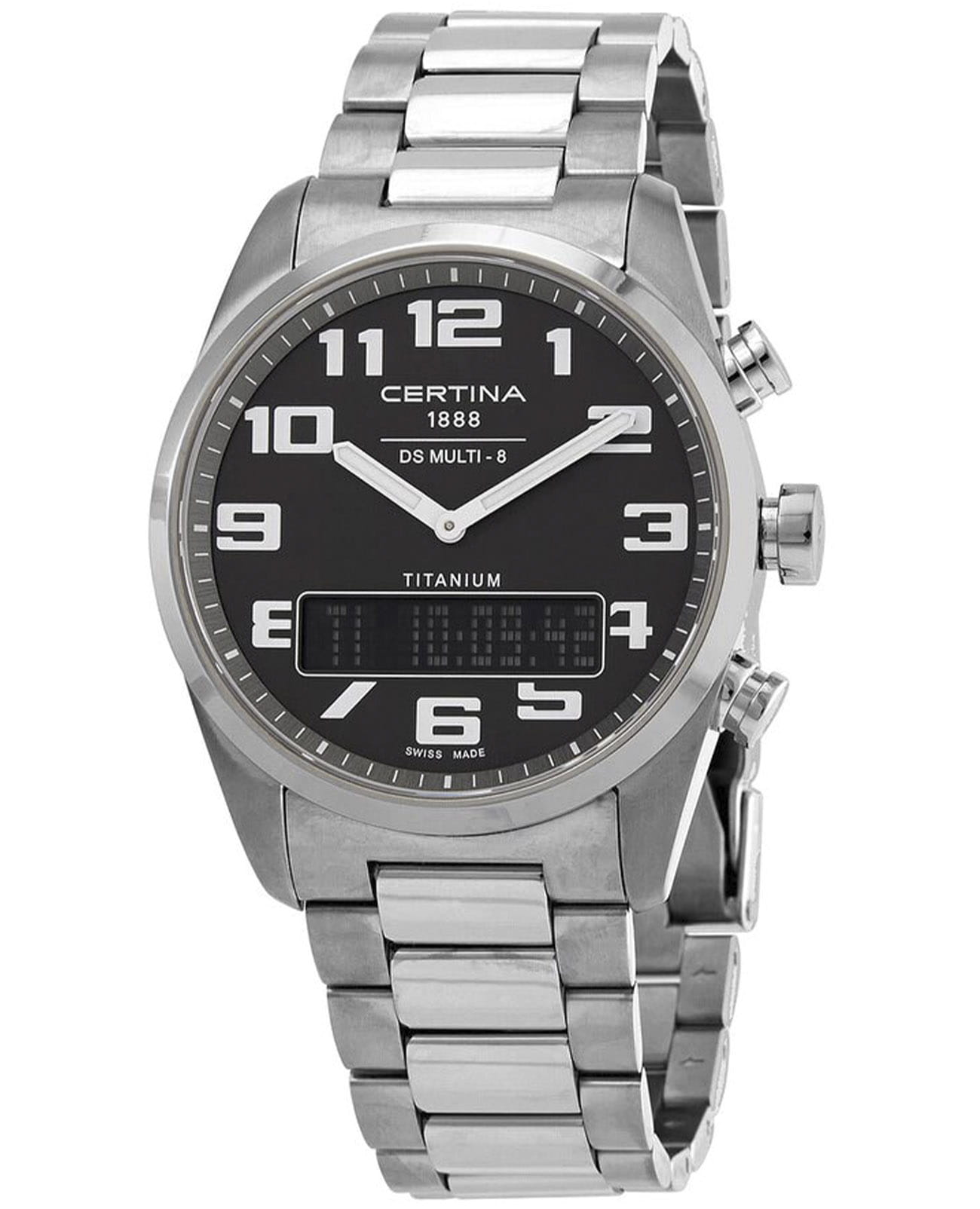 Мужские швейцарские кварцевые водонепроницаемые часы с будильникомБудильникБуди́льник — часы, в заданный момент времени подающие звуковой, световой и/или в редких случаях другой сигнал. Certina DS Multi C020.419.44.082.01, кварцевый механизм с высокой точностью. Сапфировое стеклоСапфировое стеклоПрочный и надёжный материал из кристалла сапфира синтетического происхождения, характеризующийся особой твёрдостью и устойчивостью к царапинам и повреждениям. устойчивое к появлению царапин, обладающее высокой прозрачностью. Класс водозащиты: 100 метров, позволит плавать, нырять и заниматься другими водными видами спорта. Корпус часов изготовлен из титана. Титановый браслет на раскладной застёжкеРаскладная застёжкаТакой тип застёжки используется только на браслетах из металла. Она никогда не раскрывается полностью, происходит разделение на 2 и более частей. Раскладывающая застёжка снизит вероятность потери часов к минимуму.. Круглый титановый корпус c сатинированной поверхностью. Стильный инверсионный матричный дисплей расширяет функционал часов. Второй часовой поясВторой часовой поясФункция, позволяющая отображать время двух часовых поясов одновременно. отображается на цифровом дисплее. Заостренные прямоугольные стрелки в стиле Baton с люминесцентным покрытиемЛюминесцентное покрытиеПозволяет считывать показания времени в темноте. Производители наносят на стрелки, часовые индексы, безель или поверхность циферблата светонакопительный состав, дающий холодное свечение., которое светится в темноте после непродолжительной зарядки на свету. Метки в виде арабских цифр. Задняя крышка крепится на винтах.