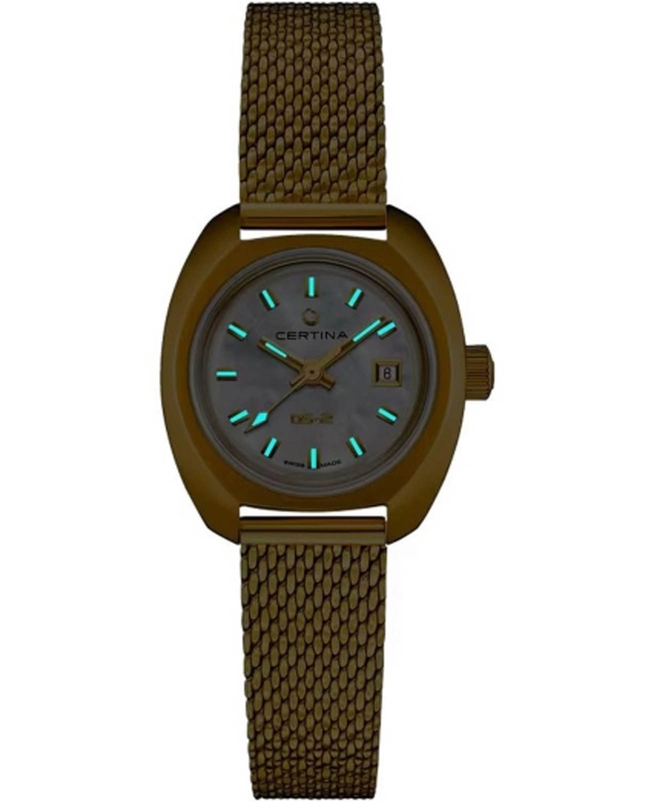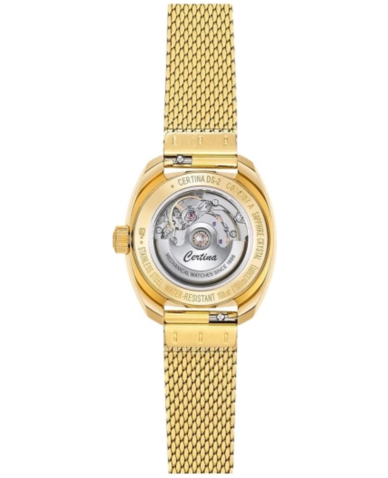 Женские швейцарские механические часы с автоподзаводом Certina DS-2 C0242071111100. Сапфировое стеклоСапфировое стеклоПрочный и надёжный материал из кристалла сапфира синтетического происхождения, характеризующийся особой твёрдостью и устойчивостью к царапинам и повреждениям. устойчивое к появлению царапин, обладающее высокой прозрачностью. Корпус изготовлен из нержавеющей стали с PVD-покрытиемPVDУльтратонкое покрытие наносится в технике вакуумного напыления, сочетает в себе нитрид титана особой прочности со слоем золота или оксида хрома. Несёт в себе декоративную или защитную функцию.. Стрелки с люминесцентным покрытиемЛюминесцентное покрытиеПозволяет считывать показания времени в темноте. Производители наносят на стрелки, часовые индексы, безель или поверхность циферблата светонакопительный состав, дающий холодное свечение. Superluminova. Окошко даты находится в положении 3 часа. Класс водозащиты: 100 метров, позволит плавать, нырять и заниматься другими водными видами спорта. Стальной браслет с PVD-покрытиемPVDУльтратонкое покрытие наносится в технике вакуумного напыления, сочетает в себе нитрид титана особой прочности со слоем золота или оксида хрома. Несёт в себе декоративную или защитную функцию. и с частичным миланским плетением на застёжке-бабочке с кнопкамиЗастёжка "бабочка"Такой вид застёжки дополняется предохранителями, помогающими избежать случайного раскрытия браслета. Обладают изящным исполнением. .