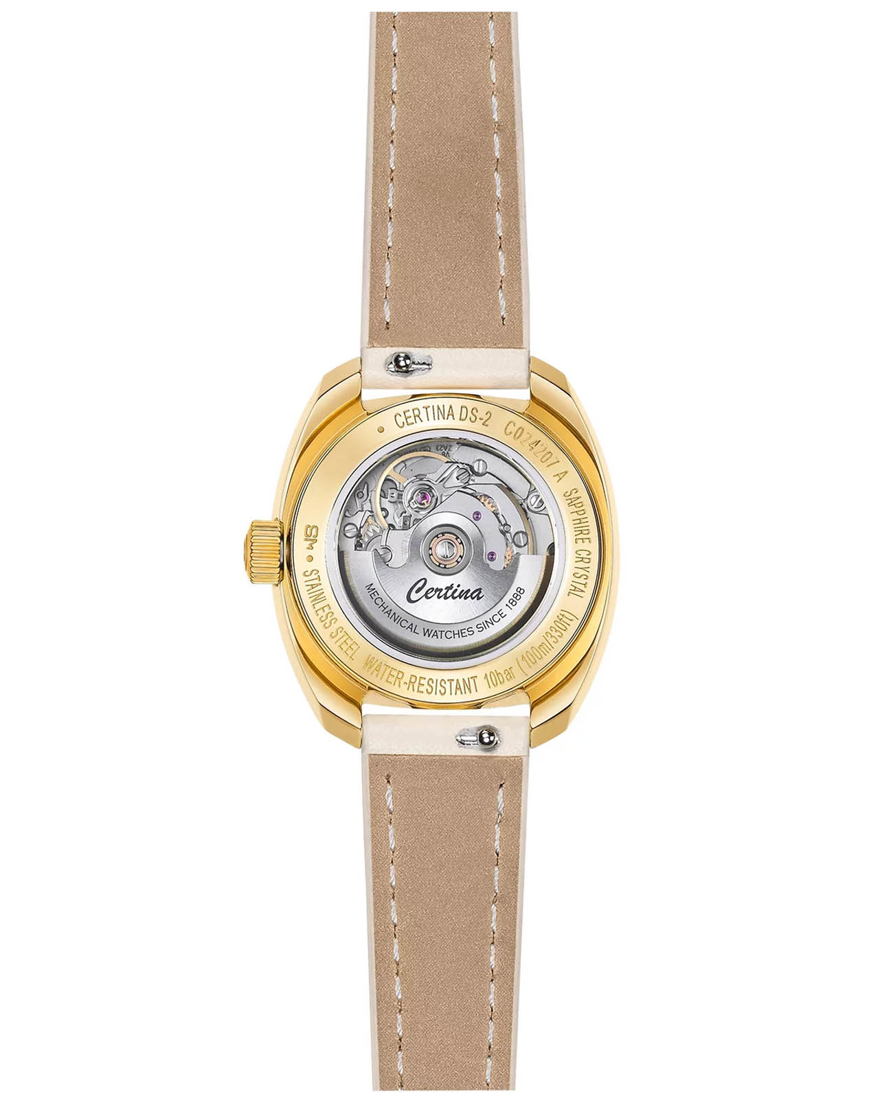 Женские швейцарские механические часы с автоподзаводом Certina DS-2 C0242073611100. Сапфировое стеклоСапфировое стеклоПрочный и надёжный материал из кристалла сапфира синтетического происхождения, характеризующийся особой твёрдостью и устойчивостью к царапинам и повреждениям. устойчивое к появлению царапин, обладающее высокой прозрачностью. Корпус изготовлен из нержавеющей стали с PVD-покрытиемPVDУльтратонкое покрытие наносится в технике вакуумного напыления, сочетает в себе нитрид титана особой прочности со слоем золота или оксида хрома. Несёт в себе декоративную или защитную функцию.. Стрелки с люминесцентным покрытиемЛюминесцентное покрытиеПозволяет считывать показания времени в темноте. Производители наносят на стрелки, часовые индексы, безель или поверхность циферблата светонакопительный состав, дающий холодное свечение. Superluminova. Окошко даты находится в положении 3 часа. Класс водозащиты: 100 метров, позволит плавать, нырять и заниматься другими водными видами спорта. Кожаный ремешок на застёжке-бабочке с кнопкамиЗастёжка "бабочка"Такой вид застёжки дополняется предохранителями, помогающими избежать случайного раскрытия браслета. Обладают изящным исполнением. .
