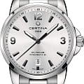Certina DS Podium Powermatic 80 (модель C034.407.11.037.00) – элегантные мужские часы, сочетающие классический стиль и передовые технологии. Корпус диаметром 38 мм выполнен из нержавеющей стали, обеспечивая надёжность и долговечность. Серебристый циферблат с солнечным узором защищён сапфировым стекломСапфировое стеклоПрочный и надёжный материал из кристалла сапфира синтетического происхождения, характеризующийся особой твёрдостью и устойчивостью к царапинам и повреждениям., устойчивым к царапинам.