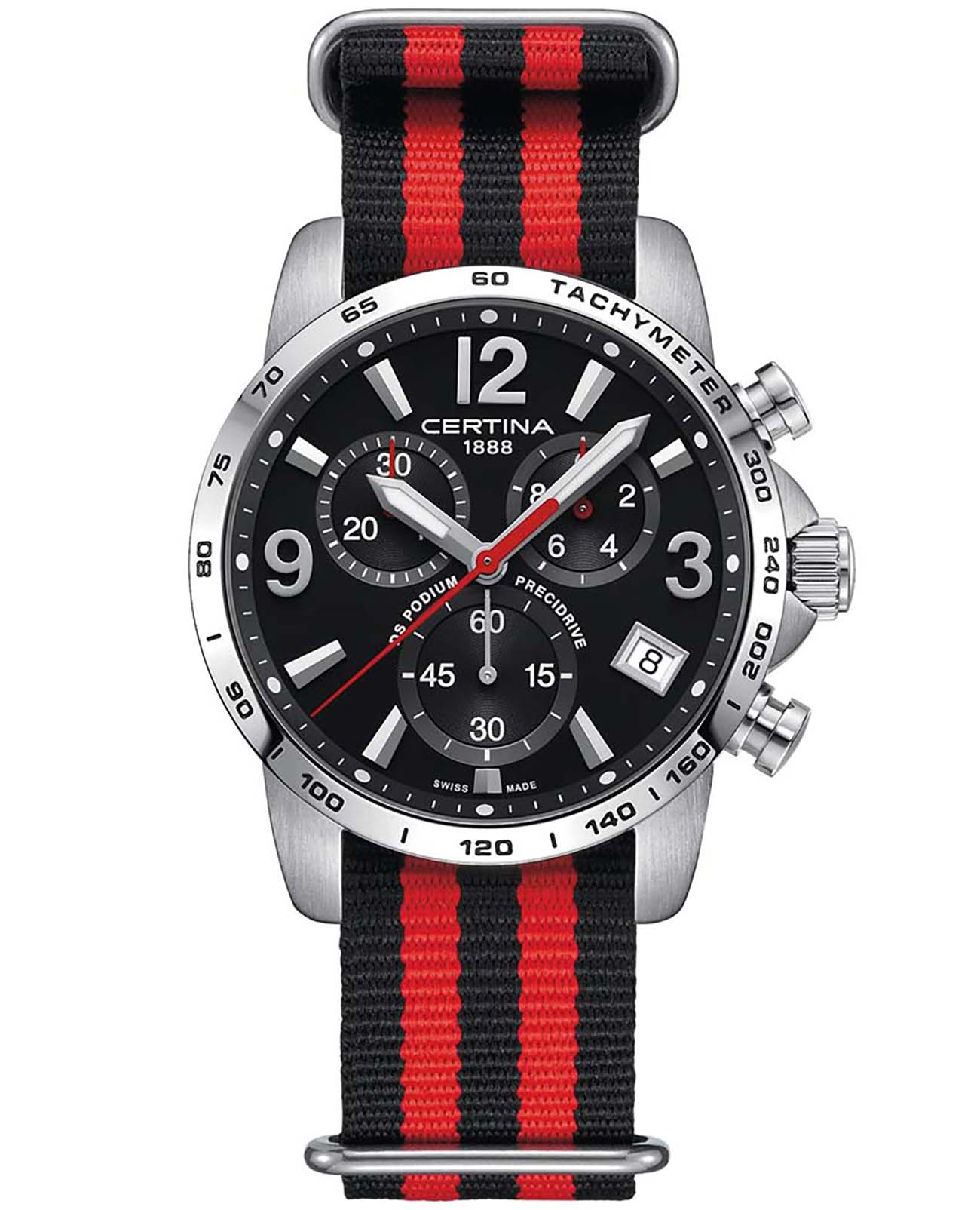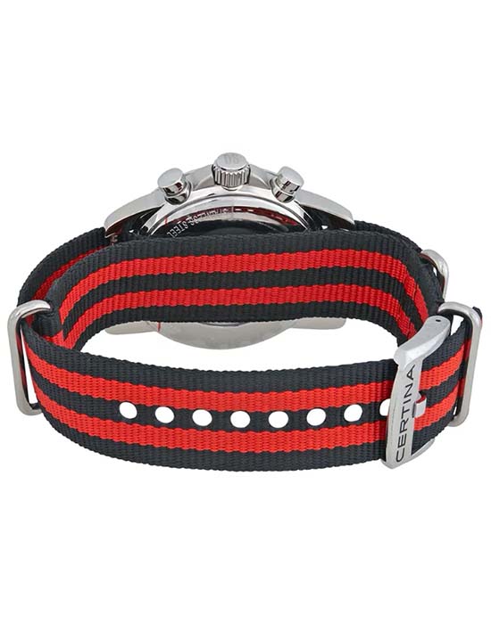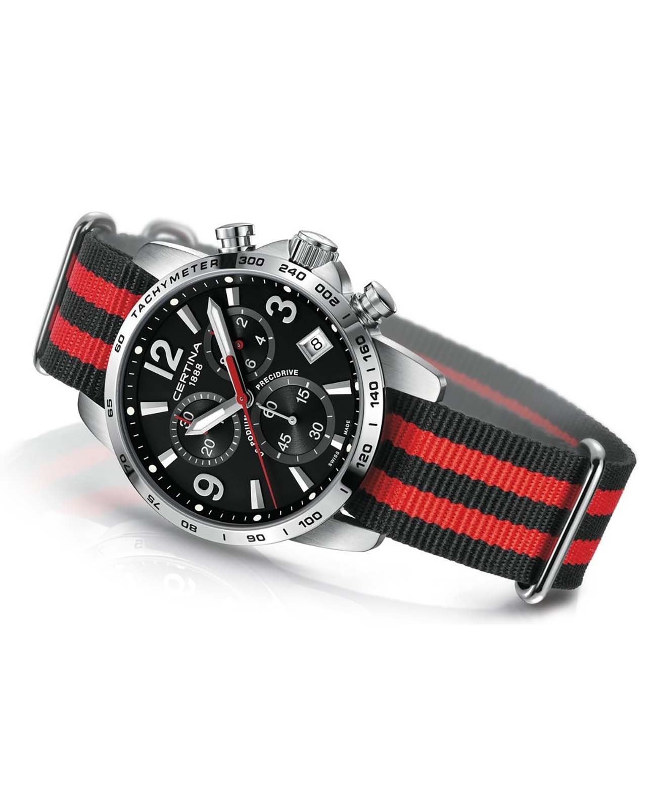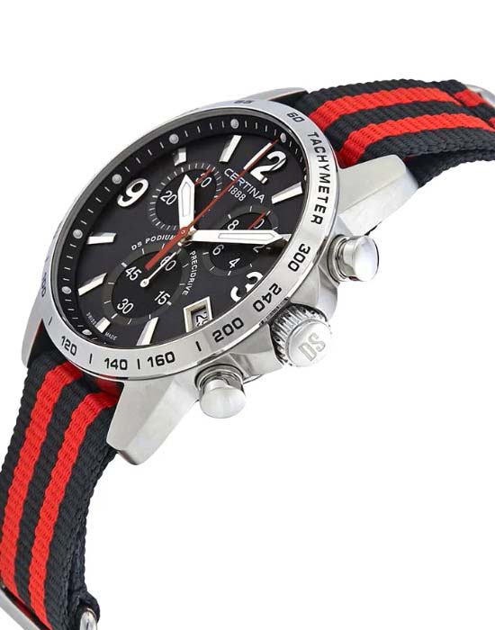 Швейцарские мужские часы Certina C034.417.18.057.00 из линейки DS Podium станут превосходным подарком для тех, кто действительно разбирается в часовом мастерстве и знает толк в качественных вещах. Наручные часы гармонично объединяет лаконичность чёрного циферблата и металлический блеск нержавеющей стали 316L. Спортивный аксессуар будет идеальным компаньоном для повседневного образа. Швейцарский кварцевый калибр ETA G10.212 Precidrive™Precidrive™Инновационный кварцевый механизм Certina. Часы, оснащённые этим швейцарским калибром, приравниваются к точности к сертифицированным хронометрам, точность хода составляет +/-10 секунд в год. отличается отменной точностью хода и никогда не подведёт вас. Водонепроницаемость до 10 бар. Реализация концепции DS ConceptDS ConceptDouble Security Concept, обозначает двойную надёжность и безупречную точность часов Certina. Двойная система защиты подразумевает обеспечение максимальной устойчивости к ударам и высоких показателей водонепроницаемости.. Антибликовая обработка для сапфирового стекла. Люминесцентная подсветкаЛюминесцентное покрытиеПозволяет считывать показания времени в темноте. Производители наносят на стрелки, часовые индексы, безель или поверхность циферблата светонакопительный состав, дающий холодное свечение.. Заводная головка с защитой. Ударопрочный корпусУдаропрочный корпусМеханизм заключён в корпус, выполненный из современных материалов, устойчивых к ударам, механическим повреждениям и падению с высоты: инновационный пластик, карбон, нержавеющая сталь, титан.. Текстильный ремешок. Окошко даты, шкала тахиметраТахиметрРазмеченная шкала, располагается на ободке или безеле часов. Тахиметр позволяет рассчитать скорость на определённом участке пути, расстояние измеряется в километрах или милях., секундомер, хронографХронографФункция позволяет измерять отрезки времени с особой точностью: часы, минуты, секунды. Верным признаком хронографа является наличие на циферблате 3 дополнительных окошек-счётчиков.. Диаметр корпуса: 41 мм. Производство и сборка: Швейцария.