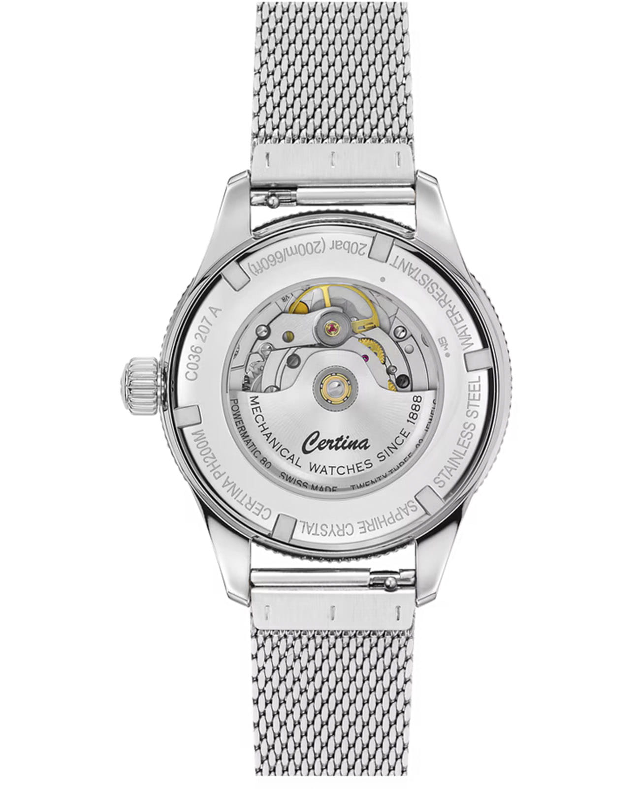 Женские механические часы с автоподзаводом Certina из коллекции DS PH200M — это сочетание надежности, элегантности и дайверского стиля. Корпус диаметром 39 мм и толщиной 11,9 мм выполнен из нержавеющей стали 316L с элементами керамики. Циферблат коричневого цвета оформлен индексами в виде меток и украшен 11 бриллиантами, придающими изделию роскошный вид. Окошко даты расположено в положении 3 часов. Циферблат защищён сапфировым стекломСапфировое стеклоПрочный и надёжный материал из кристалла сапфира синтетического происхождения, характеризующийся особой твёрдостью и устойчивостью к царапинам и повреждениям. с антибликовым покрытиемАнтибликовое покрытиеСлой оксида металла в 0,13-0,3 микрон, благодаря которому стекло часов не бликует и не отражает свет. Антибликовое покрытие уменьшает отражение света в 10 раз, обеспечивая отличную читаемость показателей циферблата., устойчивым к царапинам. Механизм — автоматический калибр Powermatic 80 с антимагнитной пружиной Nivachron™Nivachron™Специально разработанный инновационный сплав Nivachron™ повышает устойчивость часов к воздействию магнитных полей. и запасом хода 80 часов. Прозрачная задняя крышка открывает вид на механизм. Часы оснащены стальным браслетом миланского плетения на застёжке «бабочка» с кнопкамиЗастёжка "бабочка"Такой вид застёжки дополняется предохранителями, помогающими избежать случайного раскрытия браслета. Обладают изящным исполнением. . Завинчивающаяся коронка обеспечивает дополнительную защиту. Водонепроницаемость 200 м позволяет использовать часы для плавания и дайвинга. Гарантия — 24 месяца. Идеальный выбор для тех, кто ценит швейцарское качество, стиль и функциональность.