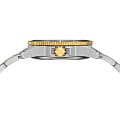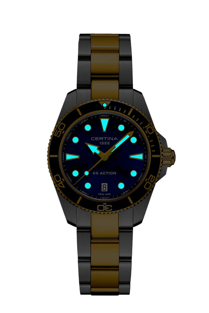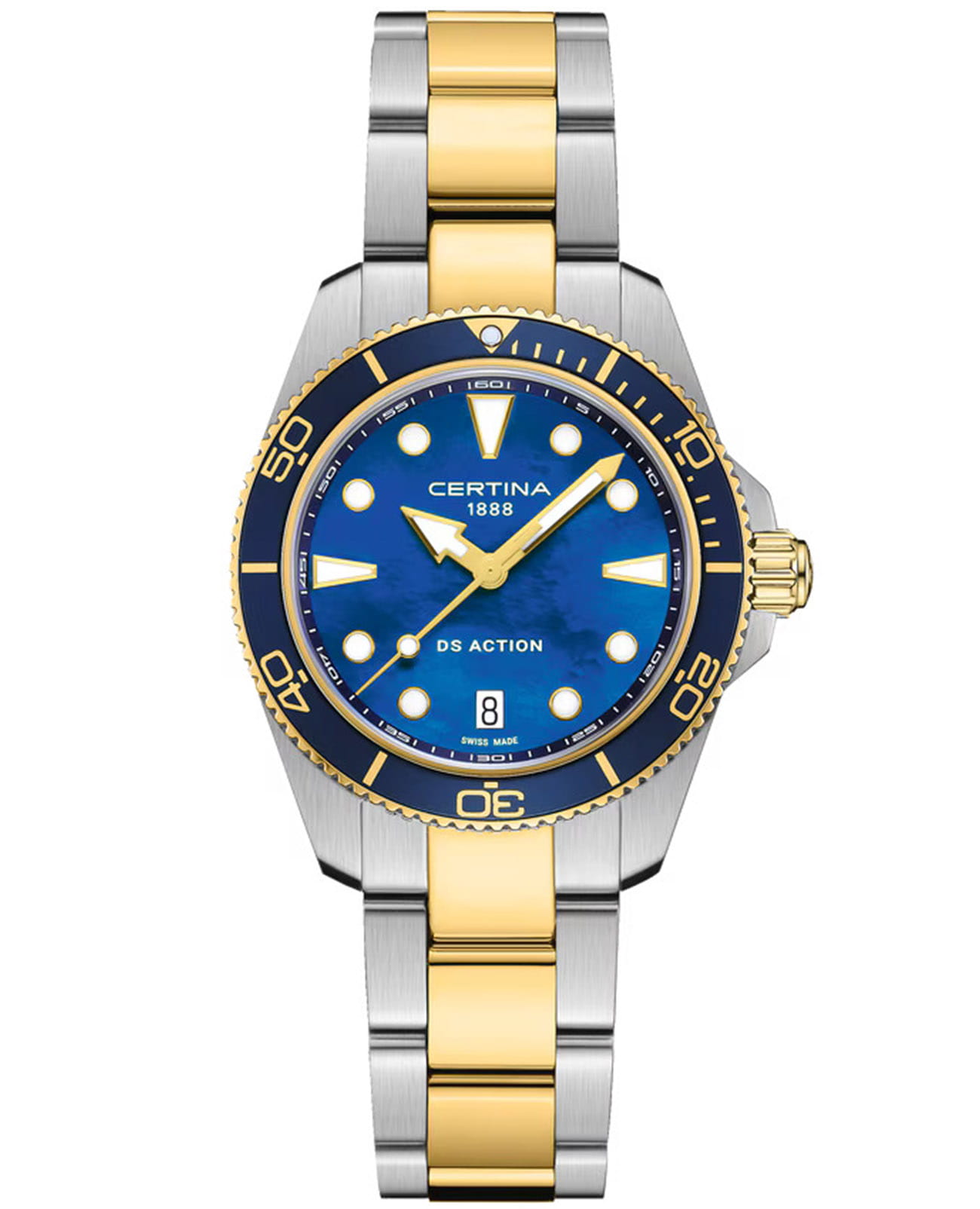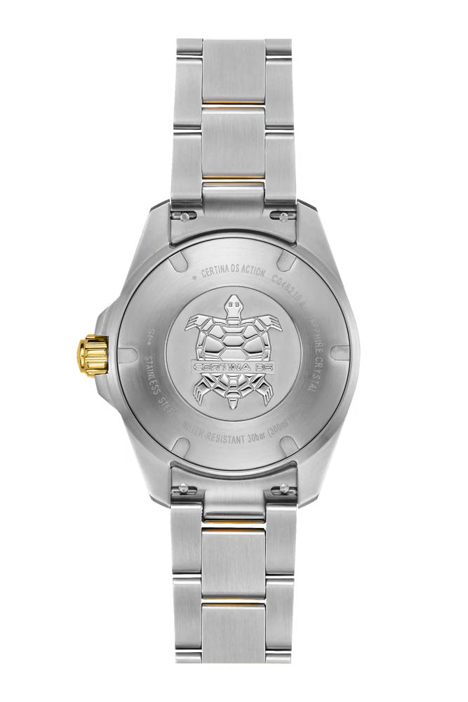 Certina DS Action Lady C048.210.22.131.00 – элегантные женские часы, сочетающие изысканный дизайн и высокую функциональность. Корпус диаметром 34,5 мм выполнен из нержавеющей стали 316L и БезельБезельВнешний ободок, закрепляющий стекло. В спортивных часах так называется поворотное кольцо с делениями на циферблате, выполняет роль таймера – замеряет отрезки времени на шкале. Неподвижный безель – элемент декора. Однонаправленно вращающийся безель на дайверских часах позволяет фиксировать моменты погружения и выныривания на поверхность. с PVD-покрытиемPVDУльтратонкое покрытие наносится в технике вакуумного напыления, сочетает в себе нитрид титана особой прочности со слоем золота или оксида хрома. Несёт в себе декоративную или защитную функцию. золотистого оттенка, придающим модели утончённый вид. Перламутровый циферблат украшен метками с люминесцентным покрытием Super-LumiNova®, обеспечивающим отличную читаемость в любых условиях. Циферблат защищён сапфировым стекломСапфировое стеклоПрочный и надёжный материал из кристалла сапфира синтетического происхождения, характеризующийся особой твёрдостью и устойчивостью к царапинам и повреждениям. с односторонним антибликовым покрытием, устойчивым к царапинам. Часы оснащены швейцарским кварцевым механизмом ETA F05.412 с технологией Precidrive™Precidrive™Инновационный кварцевый механизм Certina. Часы, оснащённые этим швейцарским калибром, приравниваются к точности к сертифицированным хронометрам, точность хода составляет +/-10 секунд в год., обеспечивающей высокую точность хода. Функция EOLEOLПредставляет собой систему, уведомляющую владельца часов о необходимости замены элемента питания. За 2 недели до полного разряда батарейки секундная стрелка перестаёт ходить чётко и начинает перепрыгивать на 3-4 деления. (индикатор окончания заряда батареи) своевременно предупреждает о необходимости замены элемента питания. Браслет из нержавеющей стали 316L с частичным PVD-покрытием оснащён системой быстрой замены, позволяющей легко менять ремешки без использования инструментов. Водонепроницаемость до 300 метров (30 бар) делает эти часы подходящими для плавания и дайвинга. Эта модель сочетает в себе надёжность, стиль и практичность, идеально подходя для современных женщин, ценящих качество и элегантность.