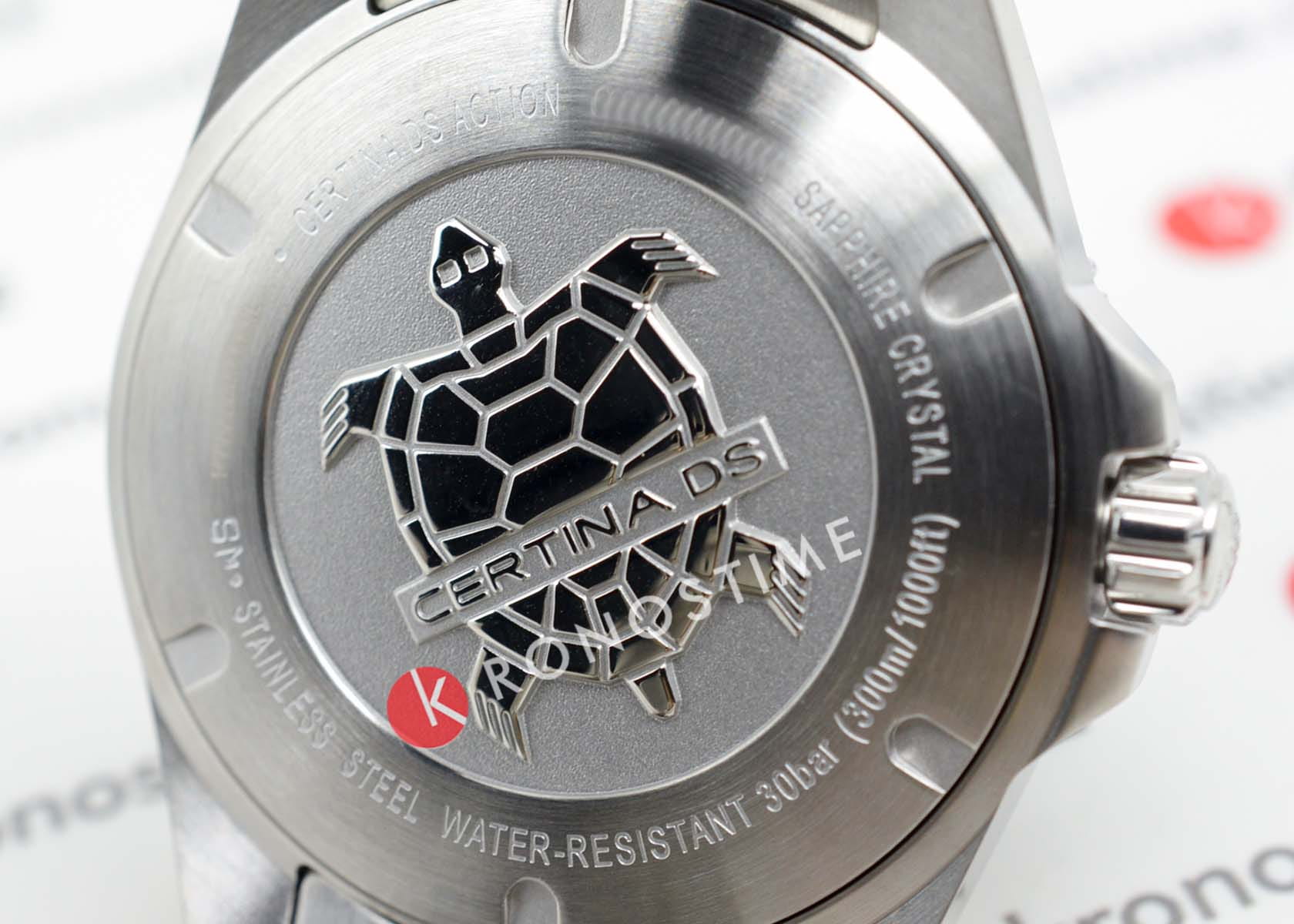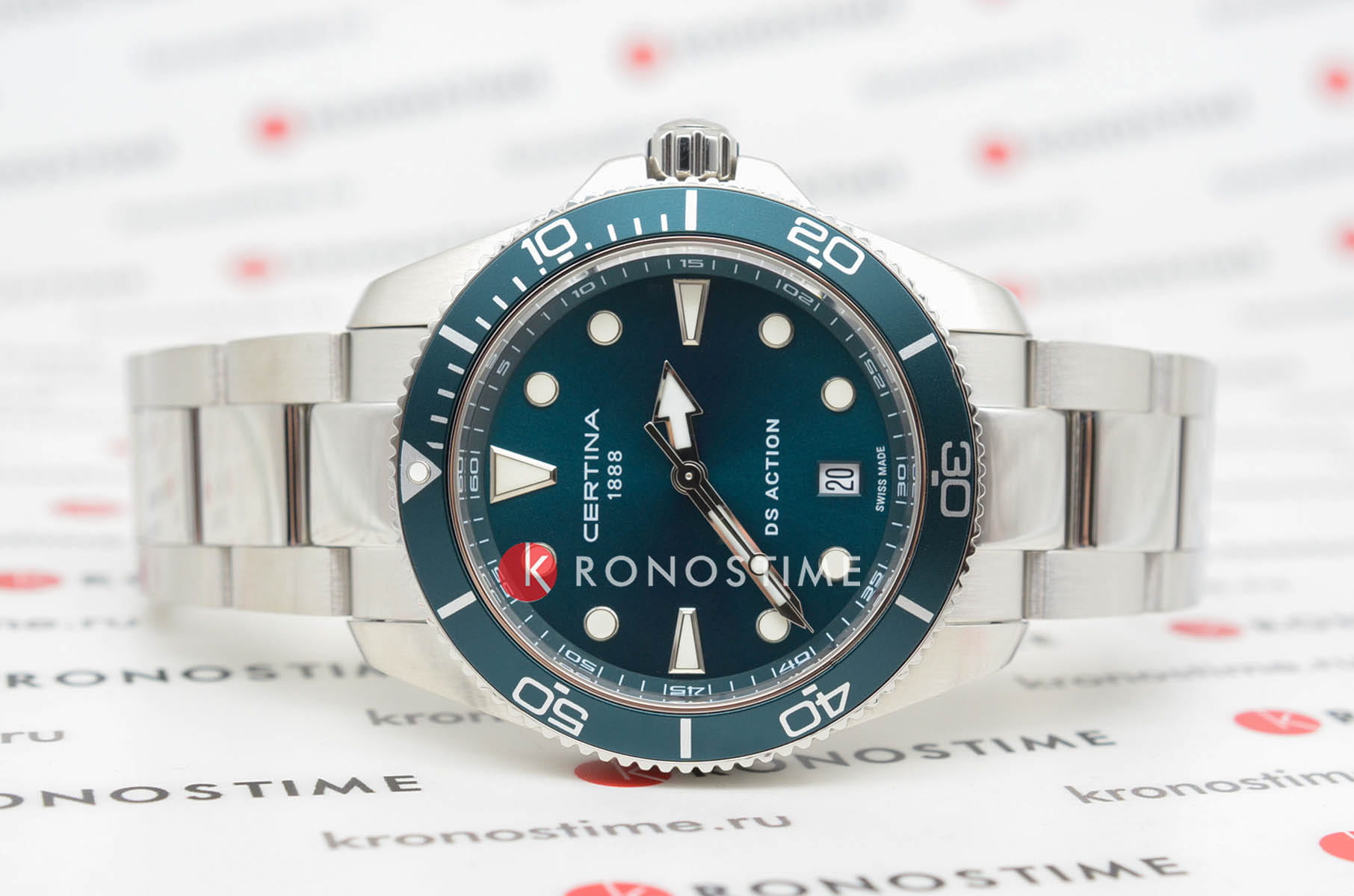 Certina DS Action C048.410.11.091.00 – элегантные мужские часы, сочетающие современный дизайн и высокую функциональность. Корпус диаметром 40 мм выполнен из нержавеющей стали 316L, обеспечивающей прочность и долговечность. Зелёный циферблат с метками и стрелками, покрытыми люминесцентным покрытиемЛюминесцентное покрытиеПозволяет считывать показания времени в темноте. Производители наносят на стрелки, часовые индексы, безель или поверхность циферблата светонакопительный состав, дающий холодное свечение., обеспечивает отличную читаемость в любых условиях, а его поверхность защищена сапфировым стекломСапфировое стеклоПрочный и надёжный материал из кристалла сапфира синтетического происхождения, характеризующийся особой твёрдостью и устойчивостью к царапинам и повреждениям. с антибликовым покрытиемАнтибликовое покрытиеСлой оксида металла в 0,13-0,3 микрон, благодаря которому стекло часов не бликует и не отражает свет. Антибликовое покрытие уменьшает отражение света в 10 раз, обеспечивая отличную читаемость показателей циферблата., устойчивым к царапинам.БезельБезельВнешний ободок, закрепляющий стекло. В спортивных часах так называется поворотное кольцо с делениями на циферблате, выполняет роль таймера – замеряет отрезки времени на шкале. Неподвижный безель – элемент декора. Однонаправленно вращающийся безель на дайверских часах позволяет фиксировать моменты погружения и выныривания на поверхность. с PVD-покрытиемPVDУльтратонкое покрытие наносится в технике вакуумного напыления, сочетает в себе нитрид титана особой прочности со слоем золота или оксида хрома. Несёт в себе декоративную или защитную функцию.. Часы оснащены швейцарским кварцевым механизмом ETA F06.412 с технологией Precidrive™Precidrive™Инновационный кварцевый механизм Certina. Часы, оснащённые этим швейцарским калибром, приравниваются к точности к сертифицированным хронометрам, точность хода составляет +/-10 секунд в год., обеспечивающей исключительную точность хода. Функция EOLEOLПредставляет собой систему, уведомляющую владельца часов о необходимости замены элемента питания. За 2 недели до полного разряда батарейки секундная стрелка перестаёт ходить чётко и начинает перепрыгивать на 3-4 деления. (индикатор окончания заряда батареи) предупреждает о необходимости замены элемента питания. Браслет из нержавеющей стали 316L оснащён системой быстрой замены, позволяющей легко адаптировать стиль часов. Водонепроницаемость 300 метров (30 бар) делает модель идеальным выбором для плавания и дайвинга.