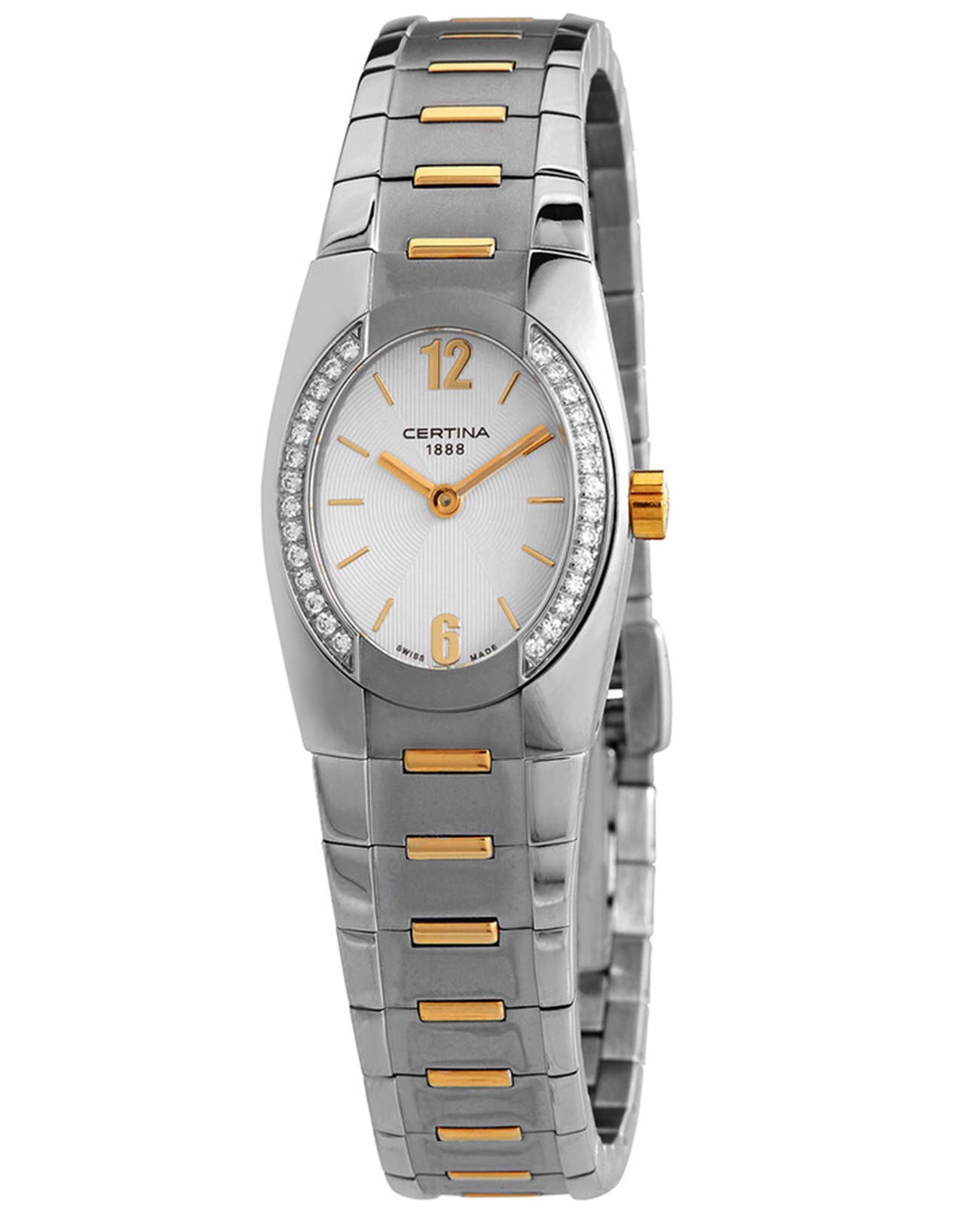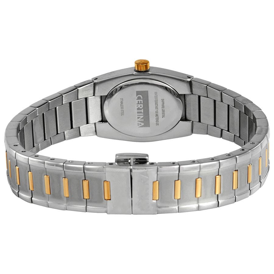 Женские швейцарские овальные часы с сапфировым стеклом Certina DS Lady Spel C322.7154.50.26, кварцевый механизм с высокой точностью. Стальной браслет с частичным IP-покрытиемIP-покрытиеМетод ионного напыления. Демонстрирует повышенную устойчивость к истиранию, окислению и химическим веществам. Под воздействием высокого давления и температуры около 1500°C молекулы металла надёжно соединяются с частицами корпуса часов.. Сапфировое стеклоСапфировое стеклоПрочный и надёжный материал из кристалла сапфира синтетического происхождения, характеризующийся особой твёрдостью и устойчивостью к царапинам и повреждениям. устойчивое к появлению царапин, обладающее высокой прозрачностью. Класс водозащиты: 100 метров, позволит плавать, нырять и заниматься другими водными видами спорта. Корпус часов изготовлен из стали.