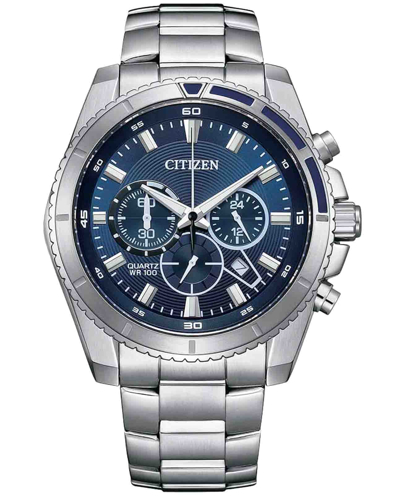 Citizen Chronograph AN8201-57L часы-хронографХронографФункция позволяет измерять отрезки времени с особой точностью: часы, минуты, секунды. Верным признаком хронографа является наличие на циферблате 3 дополнительных окошек-счётчиков. с секундомеромСекундомерСекундоме́р — прибор, способный измерять интервалы времени с точностью до долей секунды.. Корпус из нержавеющей стали диаметром 46,4 мм идеально сбалансирован. Минеральное стеклоМинеральное стеклоМинеральное стекло представляет собой искусственно выращенный минерал кварца. Такое стекло отличается особой устойчивостью к повреждениям и царапинам. Уступает по некоторым качествам сапфировому стеклу. обеспечивает отличную защиту циферблата от царапин. Часы работают на основе кварцевого механизма. Стальной браслет на раскладной застёжкеРаскладная застёжкаТакой тип застёжки используется только на браслетах из металла. Она никогда не раскрывается полностью, происходит разделение на 2 и более частей. Раскладывающая застёжка снизит вероятность потери часов к минимуму. идеально дополняют дизайн часов, обеспечивая комфортное ношение. Секундомер с точностью показаний 1c и временем измерения 60мин. Окошко даты находится между часовыми отметками 4 и 5. 12-ти и 24-х часовой формат времени отображается на отдельном циферблате. Заводная головка с защитой. Часы обладают впечатляющей водонепроницаемостью до 100WR, что делает их идеальными для повседневной носки.