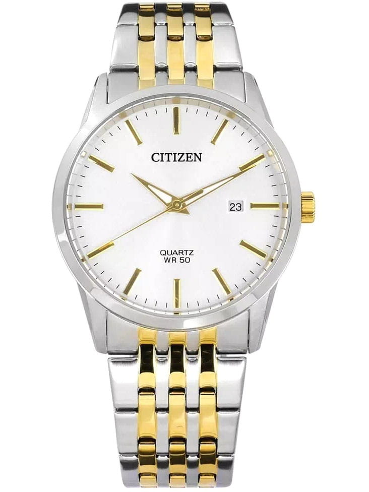 Часы Citizen BI5006-81P сочетают в себе японское качество, современный дизайн и надежность кварцевого механизма Citizen G111. Круглый корпус диаметром 39 мм выполнен из прочной нержавеющей стали, что обеспечивает долговечность и стильный внешний вид. Белый циферблат украшен метками в виде штрихов, а также дополнен окошком календаря с отображением даты и дня недели в позиции «3 часа». Стрелки с люминесцентным покрытиемЛюминесцентное покрытиеПозволяет считывать показания времени в темноте. Производители наносят на стрелки, часовые индексы, безель или поверхность циферблата светонакопительный состав, дающий холодное свечение., что обеспечивает отличную видимость в темноте. Минеральное стеклоМинеральное стеклоМинеральное стекло представляет собой искусственно выращенный минерал кварца. Такое стекло отличается особой устойчивостью к повреждениям и царапинам. Уступает по некоторым качествам сапфировому стеклу. защищает циферблат от царапин и повреждений. Рифленая заводная головка подчеркивает элегантность и практичность модели. Стальной браслет с частичным золотистым IP-покрытиемIP-покрытиеМетод ионного напыления. Демонстрирует повышенную устойчивость к истиранию, окислению и химическим веществам. Под воздействием высокого давления и температуры около 1500°C молекулы металла надёжно соединяются с частицами корпуса часов. оснащен надежной раскладной застёжкойРаскладная застёжкаТакой тип застёжки используется только на браслетах из металла. Она никогда не раскрывается полностью, происходит разделение на 2 и более частей. Раскладывающая застёжка снизит вероятность потери часов к минимуму., что обеспечивает комфортное ношение и подходит для любого случая. Водозащита до 50 метров позволяет не бояться случайных брызг и дождя.