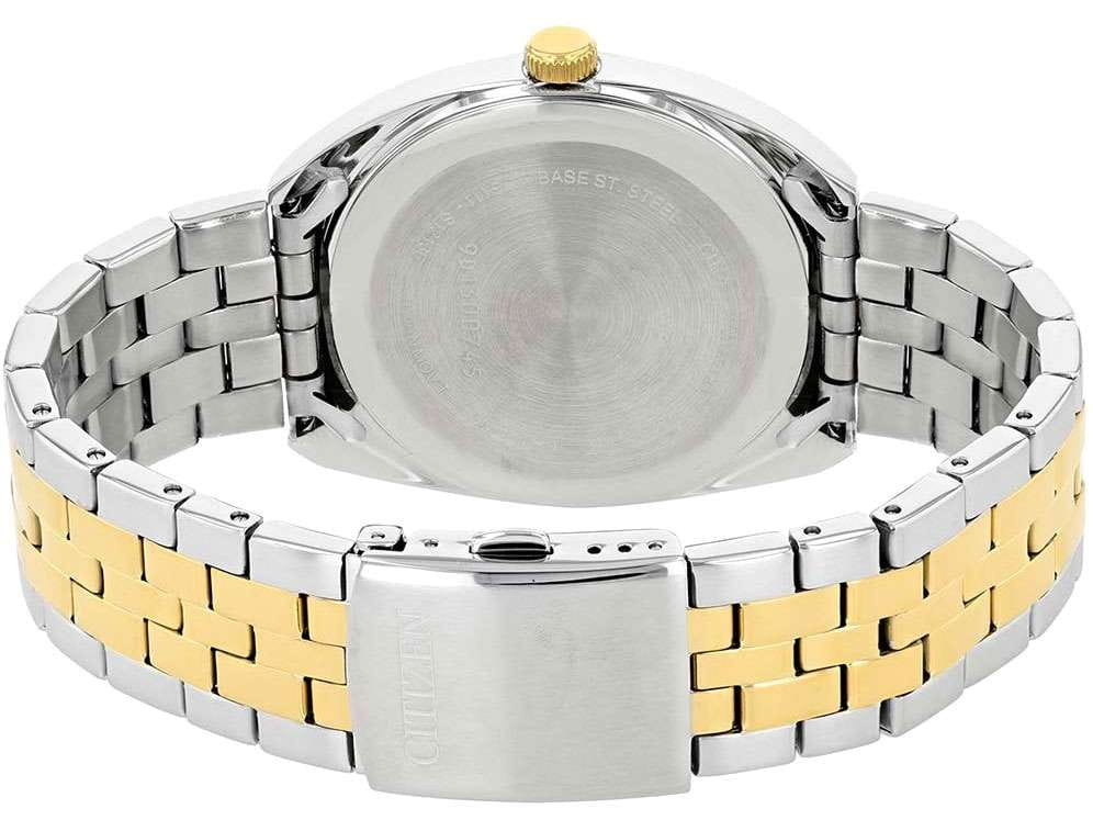 Часы Citizen BI5094-59E — это стильная и надежная модель японского производства, оснащённая высокоточным кварцевым механизмом Citizen G111. Круглый корпус диаметром 42 мм выполнен из нержавеющей стали, что придаёт изделию элегантный и современный вид, а также защищает от внешних воздействий. БезельБезельВнешний ободок, закрепляющий стекло. В спортивных часах так называется поворотное кольцо с делениями на циферблате, выполняет роль таймера – замеряет отрезки времени на шкале. Неподвижный безель – элемент декора. Однонаправленно вращающийся безель на дайверских часах позволяет фиксировать моменты погружения и выныривания на поверхность. с элегантным золотистым IP-покрытиемIP-покрытиеМетод ионного напыления. Демонстрирует повышенную устойчивость к истиранию, окислению и химическим веществам. Под воздействием высокого давления и температуры около 1500°C молекулы металла надёжно соединяются с частицами корпуса часов.. Черный циферблат оформлен минималистично, с метками в виде аккуратных штрихов и заострёнными прямоугольными стрелками в стиле Baton с люминесцентным покрытиемЛюминесцентное покрытиеПозволяет считывать показания времени в темноте. Производители наносят на стрелки, часовые индексы, безель или поверхность циферблата светонакопительный состав, дающий холодное свечение. для удобного считывания времени даже в темноте. Минеральное стеклоМинеральное стеклоМинеральное стекло представляет собой искусственно выращенный минерал кварца. Такое стекло отличается особой устойчивостью к повреждениям и царапинам. Уступает по некоторым качествам сапфировому стеклу. гарантирует защиту от царапин и сохраняет презентабельный внешний вид на долгое время. Окошко календаря с отображением числа расположено в позиции 6 часов, что добавляет функциональности и подчеркивает современный стиль модели. Рифленая заводная головка обеспечивает лёгкость настройки, а стальной браслет с частичным золотистым IP-покрытиемIP-покрытиеМетод ионного напыления. Демонстрирует повышенную устойчивость к истиранию, окислению и химическим веществам. Под воздействием высокого давления и температуры около 1500°C молекулы металла надёжно соединяются с частицами корпуса часов. и раскладывающейся застёжкой надёжно фиксирует часы на запястье. Водозащита до 50 метров позволяет не опасаться случайного контакта с водой в повседневной жизни.