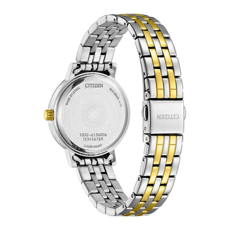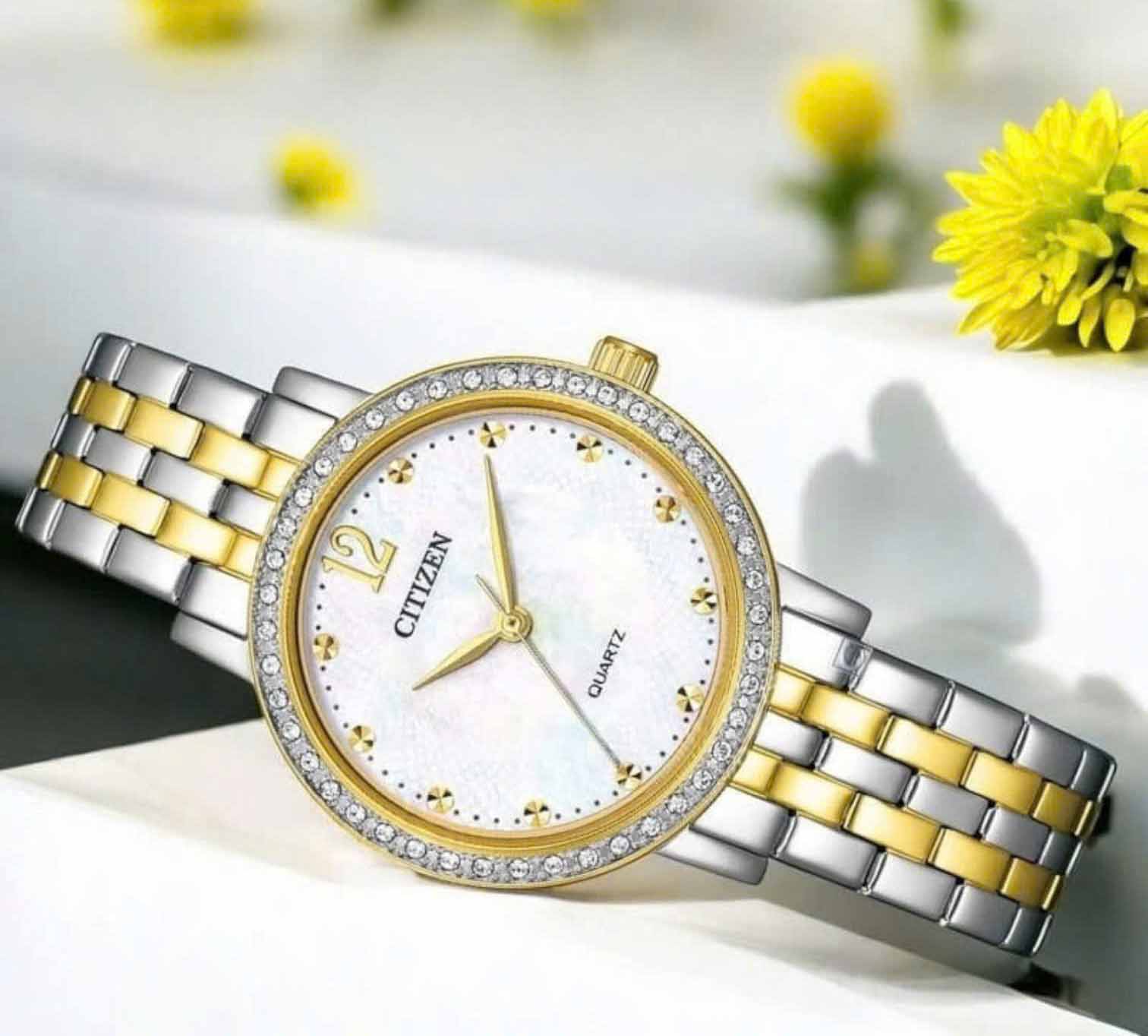 Часы Citizen EL3104-54D представляют собой элегантную модель, выполненную в Японии, сочетающую в себе современные технологии и утончённый дизайн. Корпус изготовлен из прочной нержавеющей стали, что обеспечивает долговечность и привлекательный внешний вид. Диаметр корпуса составляет 31 мм, а толщина — всего 7 мм, что делает часы изящными и аккуратными на запястье. Особое внимание привлекает безельБезельВнешний ободок, закрепляющий стекло. В спортивных часах так называется поворотное кольцо с делениями на циферблате, выполняет роль таймера – замеряет отрезки времени на шкале. Неподвижный безель – элемент декора. Однонаправленно вращающийся безель на дайверских часах позволяет фиксировать моменты погружения и выныривания на поверхность. с золотистым IP-покрытиемIP-покрытиеМетод ионного напыления. Демонстрирует повышенную устойчивость к истиранию, окислению и химическим веществам. Под воздействием высокого давления и температуры около 1500°C молекулы металла надёжно соединяются с частицами корпуса часов., украшенный мерцающими кристаллами, которые придают часам особый шарм и изысканность. Надёжный кварцевый механизм гарантирует точность хода, а водозащита уровня WR 50 позволяет не снимать часы при мытье рук или во время дождя. Перламутровый циферблат украшен часовыми индексами в виде точек и цифр, а также оснащён центральными стрелками часов, минут и секунд для удобного считывания времени и кристаллами. Минеральное стеклоМинеральное стеклоМинеральное стекло представляет собой искусственно выращенный минерал кварца. Такое стекло отличается особой устойчивостью к повреждениям и царапинам. Уступает по некоторым качествам сапфировому стеклу. устойчиво к появлению мелких царапин, сохраняя прозрачность и презентабельный вид. Стальной браслет с частичным золотистым IP-покрытиемIP-покрытиеМетод ионного напыления. Демонстрирует повышенную устойчивость к истиранию, окислению и химическим веществам. Под воздействием высокого давления и температуры около 1500°C молекулы металла надёжно соединяются с частицами корпуса часов. и раскладной застёжкойРаскладная застёжкаТакой тип застёжки используется только на браслетах из металла. Она никогда не раскрывается полностью, происходит разделение на 2 и более частей. Раскладывающая застёжка снизит вероятность потери часов к минимуму. надежно фиксирует часы на запястье, обеспечивая комфорт при ежедневном ношении.