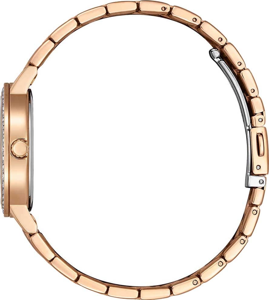 Часы Citizen EL3108-53D представляют собой элегантную модель, выполненную в Японии, сочетающую в себе современные технологии и утончённый дизайн. Корпус и браслет изготовлены из прочной нержавеющей стали с золотистым IP-покрытиемIP-покрытиеМетод ионного напыления. Демонстрирует повышенную устойчивость к истиранию, окислению и химическим веществам. Под воздействием высокого давления и температуры около 1500°C молекулы металла надёжно соединяются с частицами корпуса часов., что обеспечивает долговечность и привлекательный внешний вид. Диаметр корпуса составляет 31 мм, а толщина — всего 7 мм, что делает часы изящными и аккуратными на запястье. Особое внимание привлекает безельБезельВнешний ободок, закрепляющий стекло. В спортивных часах так называется поворотное кольцо с делениями на циферблате, выполняет роль таймера – замеряет отрезки времени на шкале. Неподвижный безель – элемент декора. Однонаправленно вращающийся безель на дайверских часах позволяет фиксировать моменты погружения и выныривания на поверхность., украшенный мерцающими кристаллами, которые придают часам особый шарм и изысканность. Надёжный кварцевый механизм гарантирует точность хода, а водозащита уровня WR 50 позволяет не снимать часы при мытье рук или во время дождя. Перламутровый циферблат украшен часовыми индексами в виде точек и цифр, а также оснащён центральными стрелками часов, минут и секунд для удобного считывания времени и кристаллами. Минеральное стеклоМинеральное стеклоМинеральное стекло представляет собой искусственно выращенный минерал кварца. Такое стекло отличается особой устойчивостью к повреждениям и царапинам. Уступает по некоторым качествам сапфировому стеклу. устойчиво к появлению мелких царапин, сохраняя прозрачность и презентабельный вид. Стальной браслет с золотистым IP-покрытиемIP-покрытиеМетод ионного напыления. Демонстрирует повышенную устойчивость к истиранию, окислению и химическим веществам. Под воздействием высокого давления и температуры около 1500°C молекулы металла надёжно соединяются с частицами корпуса часов. и раскладной застёжкойРаскладная застёжкаТакой тип застёжки используется только на браслетах из металла. Она никогда не раскрывается полностью, происходит разделение на 2 и более частей. Раскладывающая застёжка снизит вероятность потери часов к минимуму. надежно фиксирует часы на запястье, обеспечивая комфорт при ежедневном ношении.