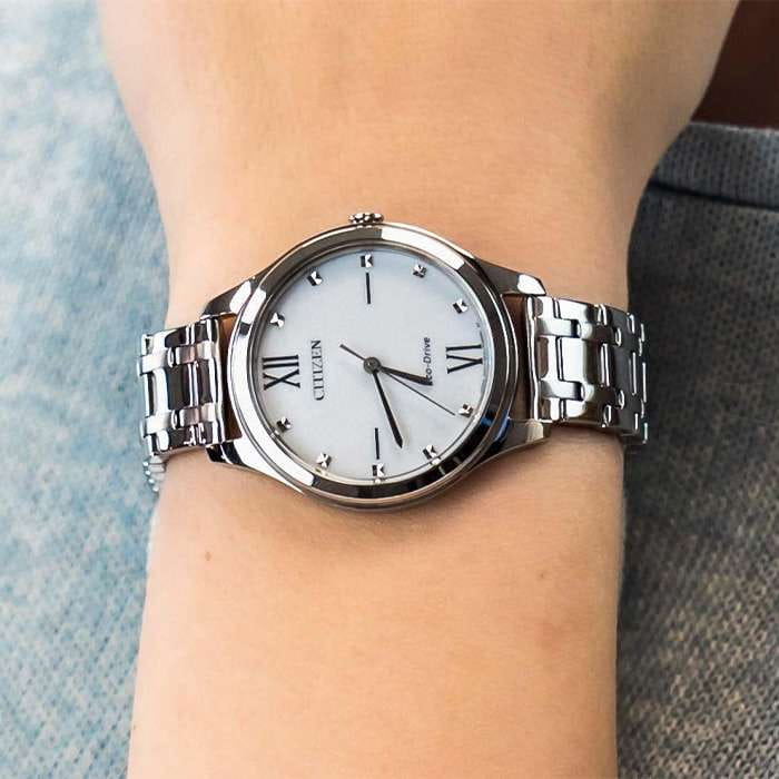 Часы Citizen EM0500-73A — это стильная модель, сочетающая в себе утонченную классику и современные технологии. Корпус и браслет изготовлены из прочной нержавеющей стали, что обеспечивает не только износостойкость, но и элегантный внешний вид. Белый циферблат отличается кристаллами и лаконичным оформлением и защищён надёжным минеральным стекломМинеральное стеклоМинеральное стекло представляет собой искусственно выращенный минерал кварца. Такое стекло отличается особой устойчивостью к повреждениям и царапинам. Уступает по некоторым качествам сапфировому стеклу., устойчивым к царапинам. Часы оснащены инновационной системой Eco-Drive, которая позволяет заряжаться от любого источника света и не требует замены батарейки, а запас энергии составляет до 180 дней. Механизм Citizen E031 гарантирует точность хода, а функция индикации заряда EOLEOLПредставляет собой систему, уведомляющую владельца часов о необходимости замены элемента питания. За 2 недели до полного разряда батарейки секундная стрелка перестаёт ходить чётко и начинает перепрыгивать на 3-4 деления. своевременно подскажет о необходимости подзарядки. Водозащита до 50 метров обеспечивает дополнительную практичность и защищает механизм от влаги при повседневном использовании. Браслет шириной 14 мм и длиной 143 мм удобно фиксируется на запястье с помощью раскладной застёжкиРаскладная застёжкаТакой тип застёжки используется только на браслетах из металла. Она никогда не раскрывается полностью, происходит разделение на 2 и более частей. Раскладывающая застёжка снизит вероятность потери часов к минимуму. с системой блокировки, что обеспечивает надёжность и комфорт в течение всего дня. Диаметр корпуса составляет 32 мм, а толщина — 7,6 мм, благодаря чему часы выглядят изящно и подходят для любого случая.