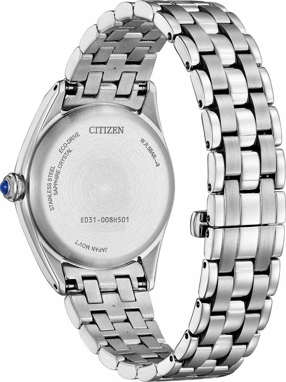 Часы Citizen EM1140-80D созданы для тех, кто ценит изящество и передовые технологии. Модель выполнена в Японии и оснащена кварцевым механизмом Citizen E031 с инновационной системой Eco-Drive, которая обеспечивает питание от солнечной энергии и не требует замены батарейки. Запаса энергии хватает на 180 дней, а функция индикации заряда и система предотвращения перезарядки гарантируют стабильную работу. Корпус диаметром 33 мм и толщиной 8,7 мм изготовлен из высококачественной стали, а перламутровый циферблат с римскими цифрами и штрихами придает часам утончённый вид. Сапфировое стеклоСапфировое стеклоПрочный и надёжный материал из кристалла сапфира синтетического происхождения, характеризующийся особой твёрдостью и устойчивостью к царапинам и повреждениям. надежно защищает циферблат от царапин и повреждений. Заводная головка украшена камнем в форме кабошона, что добавляет особого шарма аксессуару. Стальной браслет с удобной застежкой «бабочка»Застёжка "бабочка"Такой вид застёжки дополняется предохранителями, помогающими избежать случайного раскрытия браслета. Обладают изящным исполнением. обеспечивает комфортную посадку на запястье. Водозащита уровня 50WR позволяет использовать часы в повседневной жизни, не опасаясь попадания влаги. Эта модель станет стильным и надежным дополнением к вашему образу.