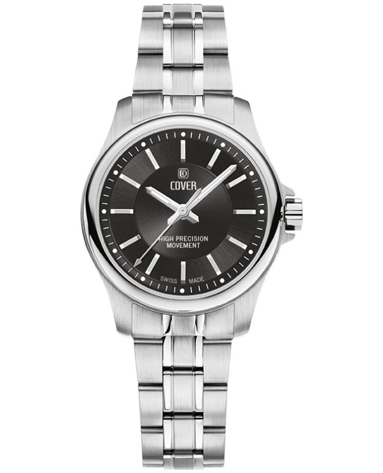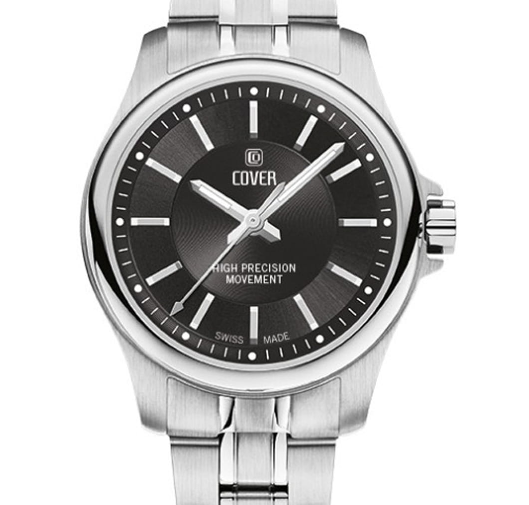 Женские наручные часы Cover CO201.01 из коллекции Marville сочетают в себе классический дизайн и высокую точность швейцарского производства. Модель обладает круглым корпусом диаметром 28 мм, изготовленным из нержавеющей стали, что придает изделию благородный внешний вид. Черный циферблат оснащен стрелками с люминесцентным покрытиемЛюминесцентное покрытиеПозволяет считывать показания времени в темноте. Производители наносят на стрелки, часовые индексы, безель или поверхность циферблата светонакопительный состав, дающий холодное свечение.. Для защиты используется сапфировое стеклоСапфировое стеклоПрочный и надёжный материал из кристалла сапфира синтетического происхождения, характеризующийся особой твёрдостью и устойчивостью к царапинам и повреждениям. с антибликовым покрытиемАнтибликовое покрытиеСлой оксида металла в 0,13-0,3 микрон, благодаря которому стекло часов не бликует и не отражает свет. Антибликовое покрытие уменьшает отражение света в 10 раз, обеспечивая отличную читаемость показателей циферблата., обеспечивающее прочную защиту от царапин и превосходную читаемость времени даже при ярком свете. Часы работают на высокоточном кварцевом механизме ETA, гарантирующем исключительную точность хода с погрешностью около 20 секунд в месяц. Браслет выполнен из нержавеющей стали и оснащен раскладной застежкойРаскладная застёжкаТакой тип застёжки используется только на браслетах из металла. Она никогда не раскрывается полностью, происходит разделение на 2 и более частей. Раскладывающая застёжка снизит вероятность потери часов к минимуму., обеспечивающей комфортное ношение и безопасность. Водонепроницаемость достигает 10 атмосфер (100 метров), что позволяет использовать их во время плавания и других водных видов спорта, однако не рекомендуется для глубоководного дайвинга. Эти швейцарские часы станут идеальным дополнением как классического, так и современного образа.