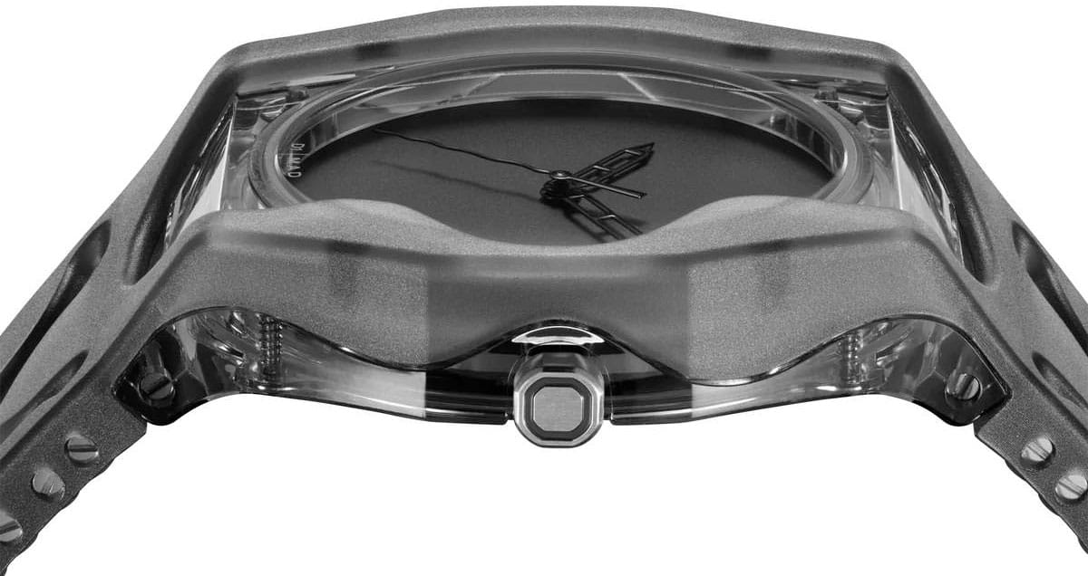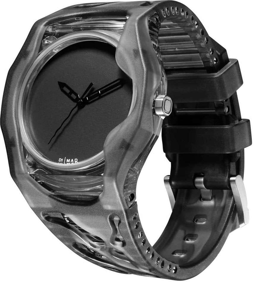 Мужские часы D1 Milano MAD Paris x D1 MDRJ01 - уникальный аксессуар. Milano и MAD Paris представили ограниченную серию часов Absence, характеризующуюся яркой цветовой гаммой и монохромной эстетикой. Часы имеют корпус из прозрачного нейлона с матовым покрытием, матовый циферблат без меток и стрелки в стиле Skeleton. Циферблат защищен минеральным стекломМинеральное стеклоМинеральное стекло представляет собой искусственно выращенный минерал кварца. Такое стекло отличается особой устойчивостью к повреждениям и царапинам. Уступает по некоторым качествам сапфировому стеклу., устойчивым к царапинам. Секундная стрелка имеет оригинальную волнообразную форму. Задняя крышка стальная, крепится на 4 винтах, каждый экземпляр имеет индивидуальный серийный номер. Ремешок оснащен классической застежкой.