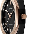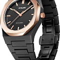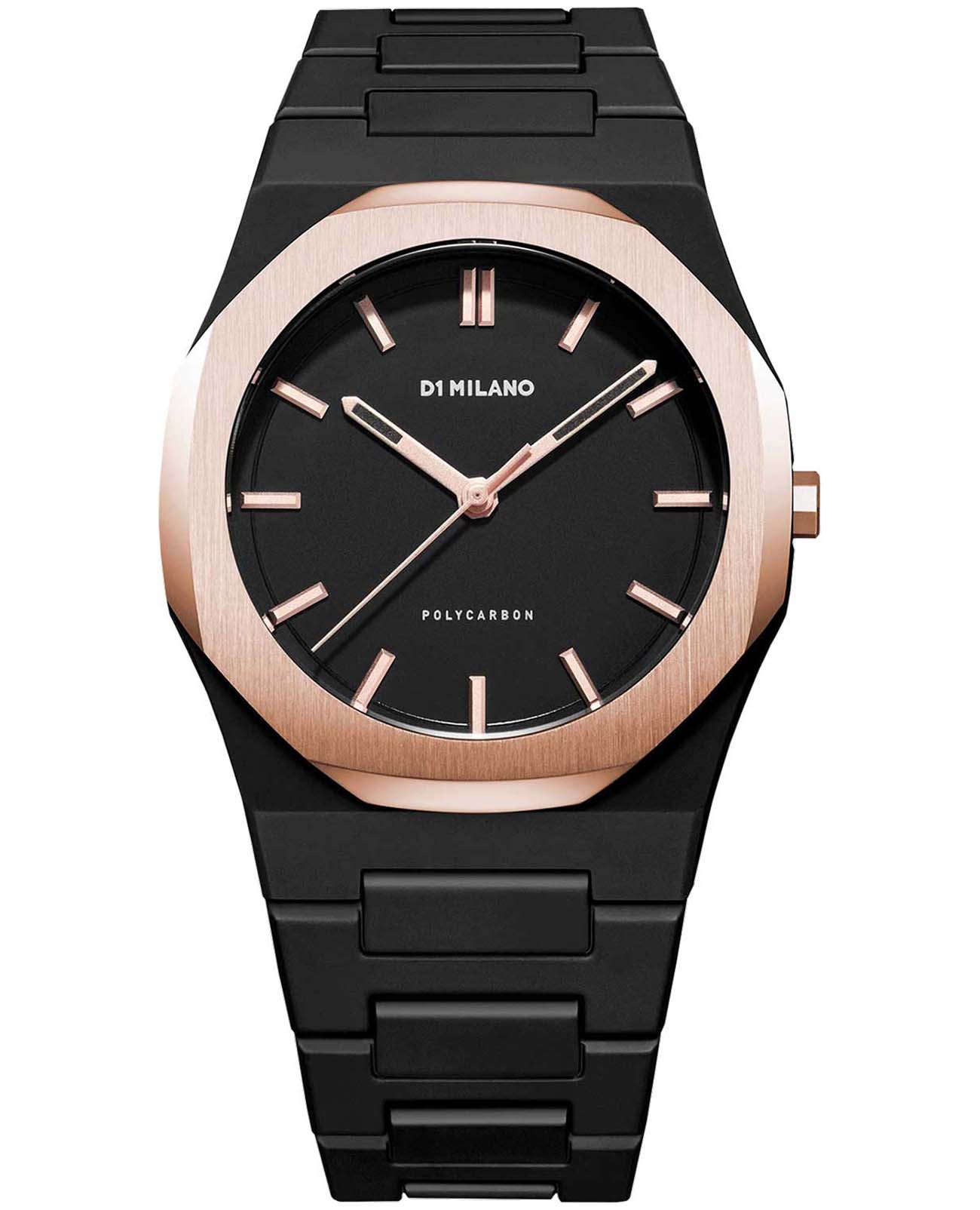 Часы D1 Milano Polycarbon PCBJ15 – молодежные часы в стиле унисекс для повседневных образов. Модель Gloaming имеет черный корпус из поликарбоната с покрытием Софт-Тач. Стальной безельБезельВнешний ободок, закрепляющий стекло. В спортивных часах так называется поворотное кольцо с делениями на циферблате, выполняет роль таймера – замеряет отрезки времени на шкале. Неподвижный безель – элемент декора. Однонаправленно вращающийся безель на дайверских часах позволяет фиксировать моменты погружения и выныривания на поверхность. с PVD-покрытиемPVDУльтратонкое покрытие наносится в технике вакуумного напыления, сочетает в себе нитрид титана особой прочности со слоем золота или оксида хрома. Несёт в себе декоративную или защитную функцию. цвета розового золота. Циферблат лаконичный с индексами в виде штрихов, защищен минеральным стекломМинеральное стеклоМинеральное стекло представляет собой искусственно выращенный минерал кварца. Такое стекло отличается особой устойчивостью к повреждениям и царапинам. Уступает по некоторым качествам сапфировому стеклу. с антибликовым покрытием.  Стрелки с люминесцентным покрытиемЛюминесцентное покрытиеПозволяет считывать показания времени в темноте. Производители наносят на стрелки, часовые индексы, безель или поверхность циферблата светонакопительный состав, дающий холодное свечение., светятся в темноте. Стальная задняя крышка на 4 винтах. Пластиковый браслет с раскладной застёжкойРаскладная застёжкаТакой тип застёжки используется только на браслетах из металла. Она никогда не раскрывается полностью, происходит разделение на 2 и более частей. Раскладывающая застёжка снизит вероятность потери часов к минимуму..