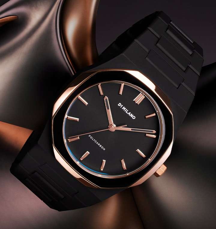 Часы D1 Milano Polycarbon PCBJ35 – молодежные часы в стиле унисекс для повседневных образов. Модель Black Mesh имеет черный корпус  из поликарбоната с покрытием Софт-Тач и  блестящий безельБезельВнешний ободок, закрепляющий стекло. В спортивных часах так называется поворотное кольцо с делениями на циферблате, выполняет роль таймера – замеряет отрезки времени на шкале. Неподвижный безель – элемент декора. Однонаправленно вращающийся безель на дайверских часах позволяет фиксировать моменты погружения и выныривания на поверхность.. Циферблат лаконичный с индексами в виде штрихов, защищен минеральным стекломМинеральное стеклоМинеральное стекло представляет собой искусственно выращенный минерал кварца. Такое стекло отличается особой устойчивостью к повреждениям и царапинам. Уступает по некоторым качествам сапфировому стеклу. с антибликовым покрытием. Стальная задняя крышка на 4 винтах.  Пластиковый браслет на застёжке «бабочка» с кнопкамиЗастёжка "бабочка"Такой вид застёжки дополняется предохранителями, помогающими избежать случайного раскрытия браслета. Обладают изящным исполнением. .