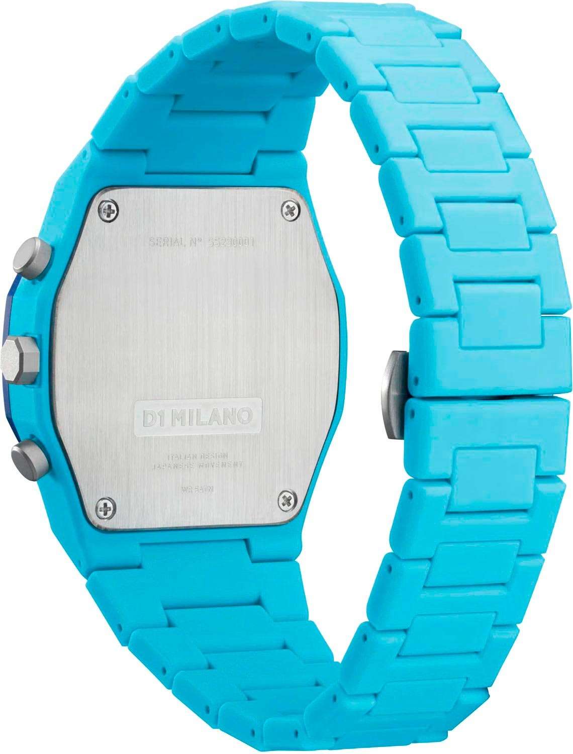 Часы D1 Milano PHBJ03 — это элегантные кварцевые часы, которые впечатляют своим функциональным дизайном, подходят как для мужчин, так и для женщин. Их высокая надежность превращает эти часы в незаменимый аксессуар на каждый день. ХронографХронографФункция позволяет измерять отрезки времени с особой точностью: часы, минуты, секунды. Верным признаком хронографа является наличие на циферблате 3 дополнительных окошек-счётчиков. оснащен секундомеромСекундомерСекундоме́р — прибор, способный измерять интервалы времени с точностью до долей секунды. и синим циферблатом, защищенным минеральным стекломМинеральное стеклоМинеральное стекло представляет собой искусственно выращенный минерал кварца. Такое стекло отличается особой устойчивостью к повреждениям и царапинам. Уступает по некоторым качествам сапфировому стеклу.. На циферблате расположены накладные метки в виде штрихов и три дополнительных циферблата с зелеными стрелками, а также окошко календаря в районе отметки 6 часов. Пластиковый синий безельБезельВнешний ободок, закрепляющий стекло. В спортивных часах так называется поворотное кольцо с делениями на циферблате, выполняет роль таймера – замеряет отрезки времени на шкале. Неподвижный безель – элемент декора. Однонаправленно вращающийся безель на дайверских часах позволяет фиксировать моменты погружения и выныривания на поверхность. отлично сочетается с голубым пластиковым браслетом, застежкой «бабочка»Застёжка "бабочка"Такой вид застёжки дополняется предохранителями, помогающими избежать случайного раскрытия браслета. Обладают изящным исполнением. . Стальная задняя крышка этих часов крепится на 4-х винтах. Водонепроницаемость до 50 метров делает эти часы идеальным выбором для повседневного использования.