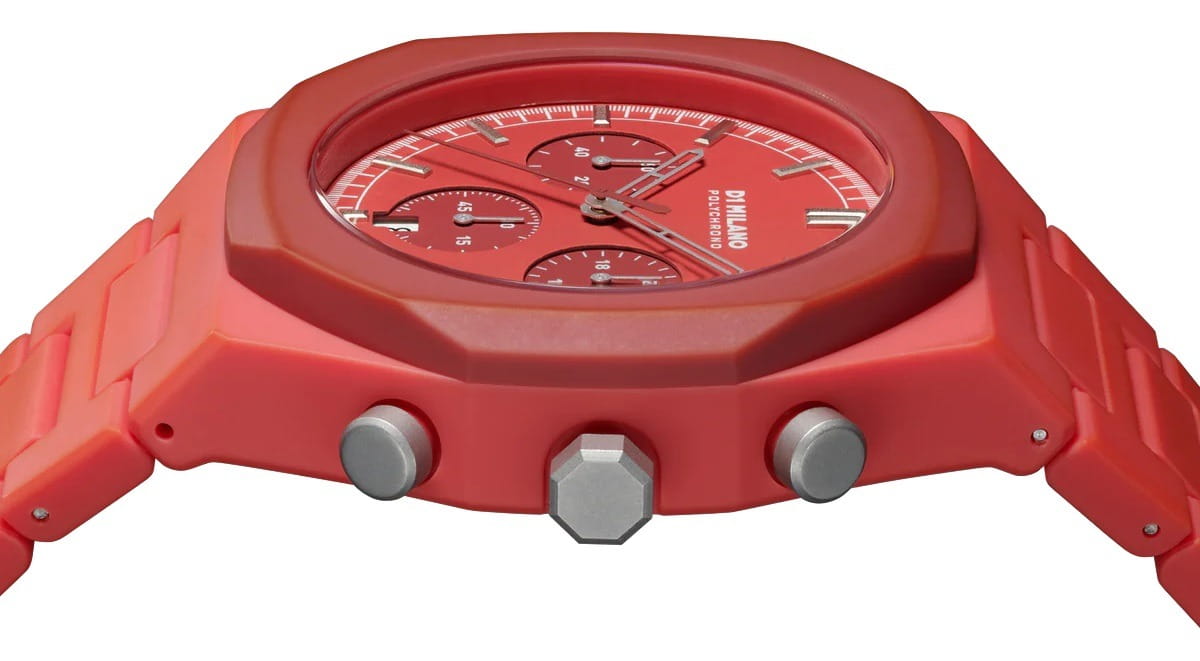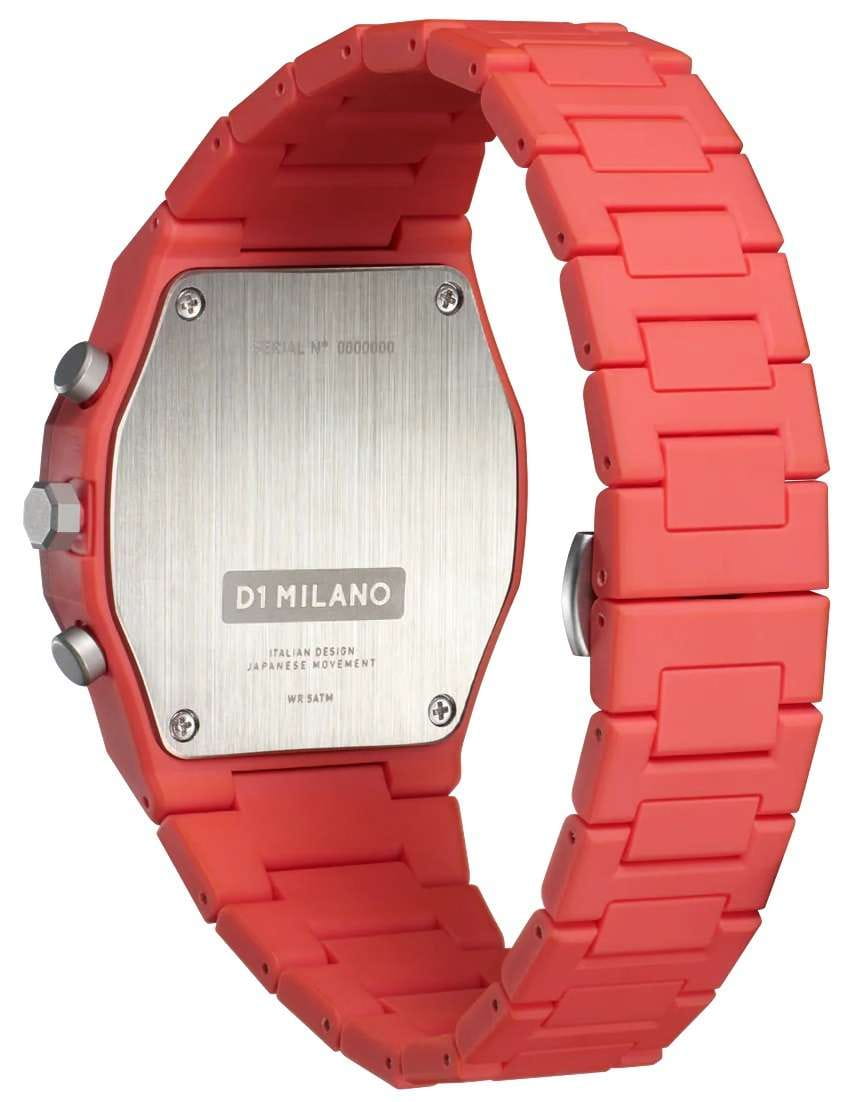 Часы D1 Milano PHBJ05 — это элегантные кварцевые часы, которые впечатляют своим функциональным дизайном, подходят как для мужчин, так и для женщин. Их высокая надежность превращает эти часы в незаменимый аксессуар на каждый день. ХронографХронографФункция позволяет измерять отрезки времени с особой точностью: часы, минуты, секунды. Верным признаком хронографа является наличие на циферблате 3 дополнительных окошек-счётчиков. оснащен секундомеромСекундомерСекундоме́р — прибор, способный измерять интервалы времени с точностью до долей секунды. и красным циферблатом, защищенным минеральным стекломМинеральное стеклоМинеральное стекло представляет собой искусственно выращенный минерал кварца. Такое стекло отличается особой устойчивостью к повреждениям и царапинам. Уступает по некоторым качествам сапфировому стеклу.. На циферблате расположены накладные метки в виде штрихов и три дополнительных циферблата с серебристыми стрелками, а также окошко календаря в районе отметки 6 часов. Пластиковый ярко-красный безельБезельВнешний ободок, закрепляющий стекло. В спортивных часах так называется поворотное кольцо с делениями на циферблате, выполняет роль таймера – замеряет отрезки времени на шкале. Неподвижный безель – элемент декора. Однонаправленно вращающийся безель на дайверских часах позволяет фиксировать моменты погружения и выныривания на поверхность. отлично сочетается с красным пластиковым браслетом, застежкой «бабочка»Застёжка "бабочка"Такой вид застёжки дополняется предохранителями, помогающими избежать случайного раскрытия браслета. Обладают изящным исполнением. . Стальная задняя крышка этих часов крепится на 4-х винтах. Водонепроницаемость до 50 метров делает эти часы идеальным выбором для повседневного использования.