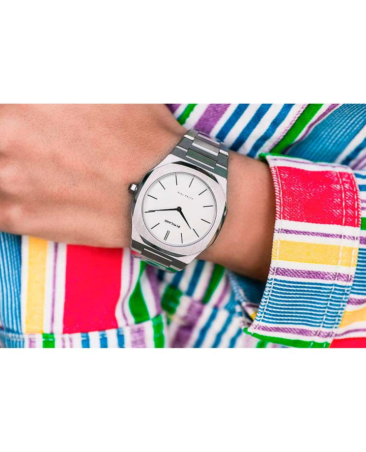 Женские наручные часы D1 Milano UTBL01 из коллекции Ultra Thin сочетают в себе классический дизайн и современные технологии. Модель обладает восьмиугольным корпусом диаметром 38 мм, изготовленным из нержавеющей стали 316L, что обеспечивает высокую устойчивость к внешним воздействиям. Браслет также выполнен из нержавеющей стали с раскладной застежкойРаскладной замокДанный вариант застежки используется только на часах с металлическим браслетом. Отличительная особенность такого крепления в том, что длина браслета становится универсальной и вы можете самостоятельно отрегулировать нужный вам размер – застежка просто двигается по браслету часов., гарантирующей комфортное ношение и безопасность. Белый циферблат украшен метками и оснащен стрелочным механизмом, который подчеркивает элегантность модели. Для защиты используется сапфировое стеклоСапфировое стеклоПрочный и надёжный материал из кристалла сапфира синтетического происхождения, характеризующийся особой твёрдостью и устойчивостью к царапинам и повреждениям. с антибликовым покрытиемАнтибликовое покрытиеСлой оксида металла в 0,13-0,3 микрон, благодаря которому стекло часов не бликует и не отражает свет. Антибликовое покрытие уменьшает отражение света в 10 раз, обеспечивая отличную читаемость показателей циферблата., обеспечивающее прочную защиту от царапин и бликов. Часы работают на кварцевом механизме, что гарантирует точность хода с погрешностью +/- 15 секунд в месяц, не требуя регулярного подзавода. Водонепроницаемость часов достигает 5 атмосфер (50 метров), что позволяет использовать их во время мытья рук или плавания, однако не рекомендуется для глубоководного дайвинга. Толщина ультратонкого корпуса составляет всего 6 мм, делая аксессуар легким и удобным для повседневного использования.