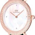Daniel Wellington Crystaline Bezel 32 Green Croc White MOP RG — женские наручные часы с ярким акцентом, созданные для тех, кто ценит элегантность и выразительность. Круглый корпус диаметром 32 мм изготовлен из нержавеющей стали с PVD-покрытиемPVDУльтратонкое покрытие наносится в технике вакуумного напыления, сочетает в себе нитрид титана особой прочности со слоем золота или оксида хрома. Несёт в себе декоративную или защитную функцию. в оттенке розового золота, а безель полностью инкрустирован кристаллами, образующими сияющий ореол вокруг циферблата. Минеральное стеклоМинеральное стеклоМинеральное стекло представляет собой искусственно выращенный минерал кварца. Такое стекло отличается особой устойчивостью к повреждениям и царапинам. Уступает по некоторым качествам сапфировому стеклу. устойчивое к мелким механическим повреждениям. Белый циферблат из натурального перламутра подчёркнут минималистичными метками и изящными стрелками в цвете розового золота. Такой дизайн гармонично сочетает современный стиль и женственность. Модель оснащена кварцевым механизмом, обеспечивающим точность хода. Ремешок выполнен из натуральной кожи зелёного оттенка с тиснением под крокодила и фиксируется классической пряжкой. Daniel Wellington — это украшение на каждый день и для особых случаев, где блеск кристаллов и благородный перламутр создают впечатляющий дуэт.