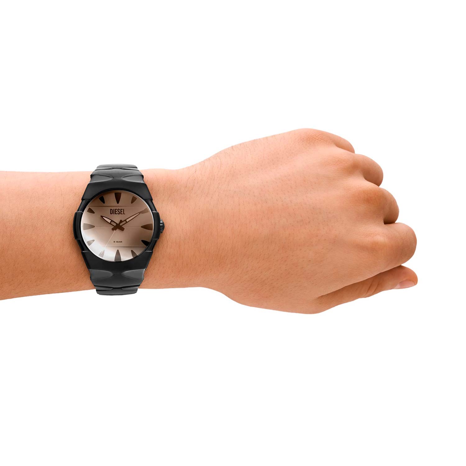 Мужские кварцевые часы Diesel DZ2213 — это стильный и современный аксессуар, подчёркивающий индивидуальность и хороший вкус своего владельца. Модель выполнена в смелом дизайне, сочетающем матовые и полированные поверхности, что придаёт модели динамику и выразительность. Корпус изготовлен из нержавеющей стали с покрытием чёрного цвета, устойчивым к царапинам и внешним воздействиям. Циферблат серебристого оттенка выполнен по технологии Sunray, создающей эффект расходящихся солнечных лучей, и дополнен штриховыми метками. Защиту циферблата обеспечивает минеральное стеклоМинеральное стеклоМинеральное стекло представляет собой искусственно выращенный минерал кварца. Такое стекло отличается особой устойчивостью к повреждениям и царапинам. Уступает по некоторым качествам сапфировому стеклу., выдерживающее повседневные нагрузки. Заводная головка имеет рифлёную форму, что делает её удобной в использовании и добавляет модели спортивного акцента. Часы водонепроницаемы до 50 метров (), что позволяет использовать их в повседневных условиях — при мытье рук или под дождём. Браслет из стали с чёрным покрытием оснащён раскладной застёжкойРаскладная застёжкаТакой тип застёжки используется только на браслетах из металла. Она никогда не раскрывается полностью, происходит разделение на 2 и более частей. Раскладывающая застёжка снизит вероятность потери часов к минимуму. с двумя кнопками, обеспечивающей надёжную фиксацию и комфорт при ношении. Диаметр корпуса составляет 42 мм, толщина — 10 мм, что делает часы сбалансированными и удобными на запястье. Эти часы станут универсальным аксессуаром для тех, кто ценит сочетание стиля, надёжности и современного дизайна — идеальный выбор для уверенных в себе мужчин, следящих за образом и предпочитающих выделяться.