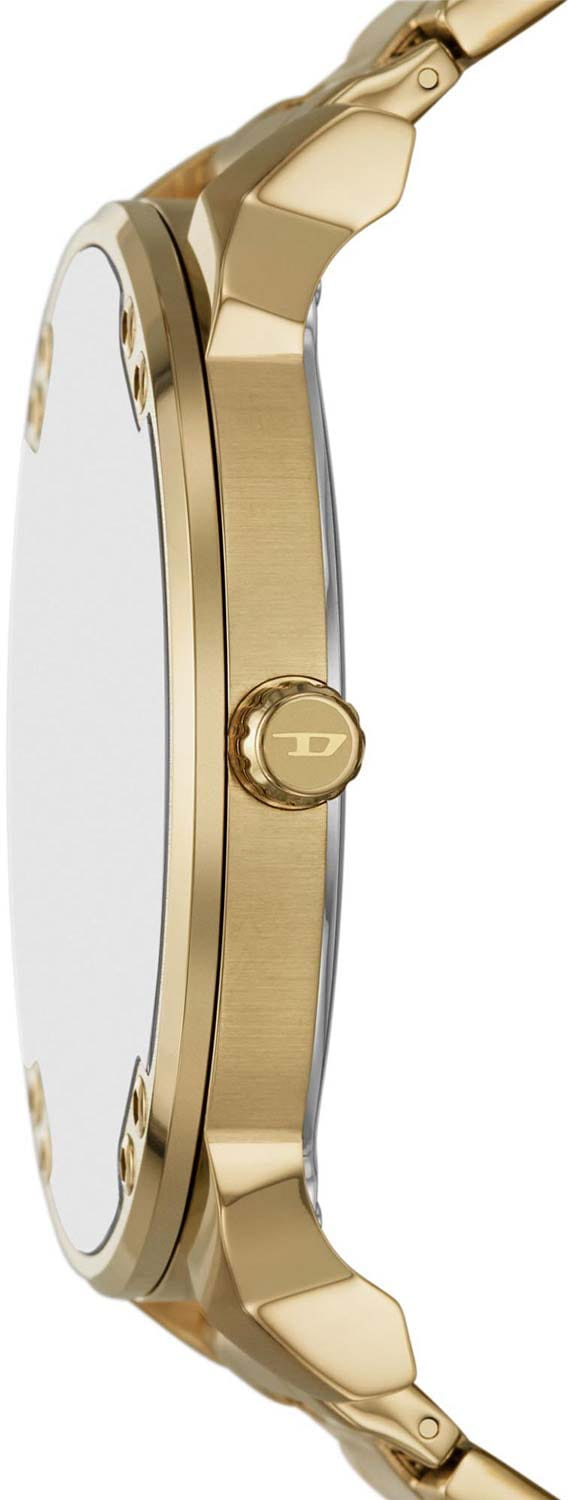 Мужские кварцевые часы Diesel Mr. Daddy 2.0 DZ7490 — это многофункциональный аксессуар, сочетающий в себе стиль и технические возможности. Модель оснащена хронографомХронографФункция позволяет измерять отрезки времени с особой точностью: часы, минуты, секунды. Верным признаком хронографа является наличие на циферблате 3 дополнительных окошек-счётчиков. с секундомеромСекундомерСекундоме́р — прибор, способный измерять интервалы времени с точностью до долей секунды., что делает её удобной для измерения времени с высокой точностью. Циферблат золотистого цвета, а его дизайн включает штриховые метки, а также окошко даты в положении 3 часов. Защиту циферблата обеспечивает Минеральное стеклоМинеральное стеклоМинеральное стекло представляет собой искусственно выращенный минерал кварца. Такое стекло отличается особой устойчивостью к повреждениям и царапинам. Уступает по некоторым качествам сапфировому стеклу., устойчивое к мелким повреждениям. Корпус диаметром 54 мм выполнен из стали с золотым PVD-покрытиемPVDУльтратонкое покрытие наносится в технике вакуумного напыления, сочетает в себе нитрид титана особой прочности со слоем золота или оксида хрома. Несёт в себе декоративную или защитную функцию., включающим матовые и полированные детали. Стальной браслет с золотым PVD-покрытиемPVDУльтратонкое покрытие наносится в технике вакуумного напыления, сочетает в себе нитрид титана особой прочности со слоем золота или оксида хрома. Несёт в себе декоративную или защитную функцию. оснащён раскладной застёжкойРаскладная застёжкаТакой тип застёжки используется только на браслетах из металла. Она никогда не раскрывается полностью, происходит разделение на 2 и более частей. Раскладывающая застёжка снизит вероятность потери часов к минимуму. с двумя кнопками, обеспечивающей комфорт и надёжную фиксацию на запястье. Водонепроницаемость 30WR позволяет использовать модель при мытье рук или под лёгким дождём. Эти часы станут универсальным аксессуаром для тех, кто ценит сочетание функциональности, эстетики и надёжности — идеальный выбор для повседневного использования и активного образа жизни.