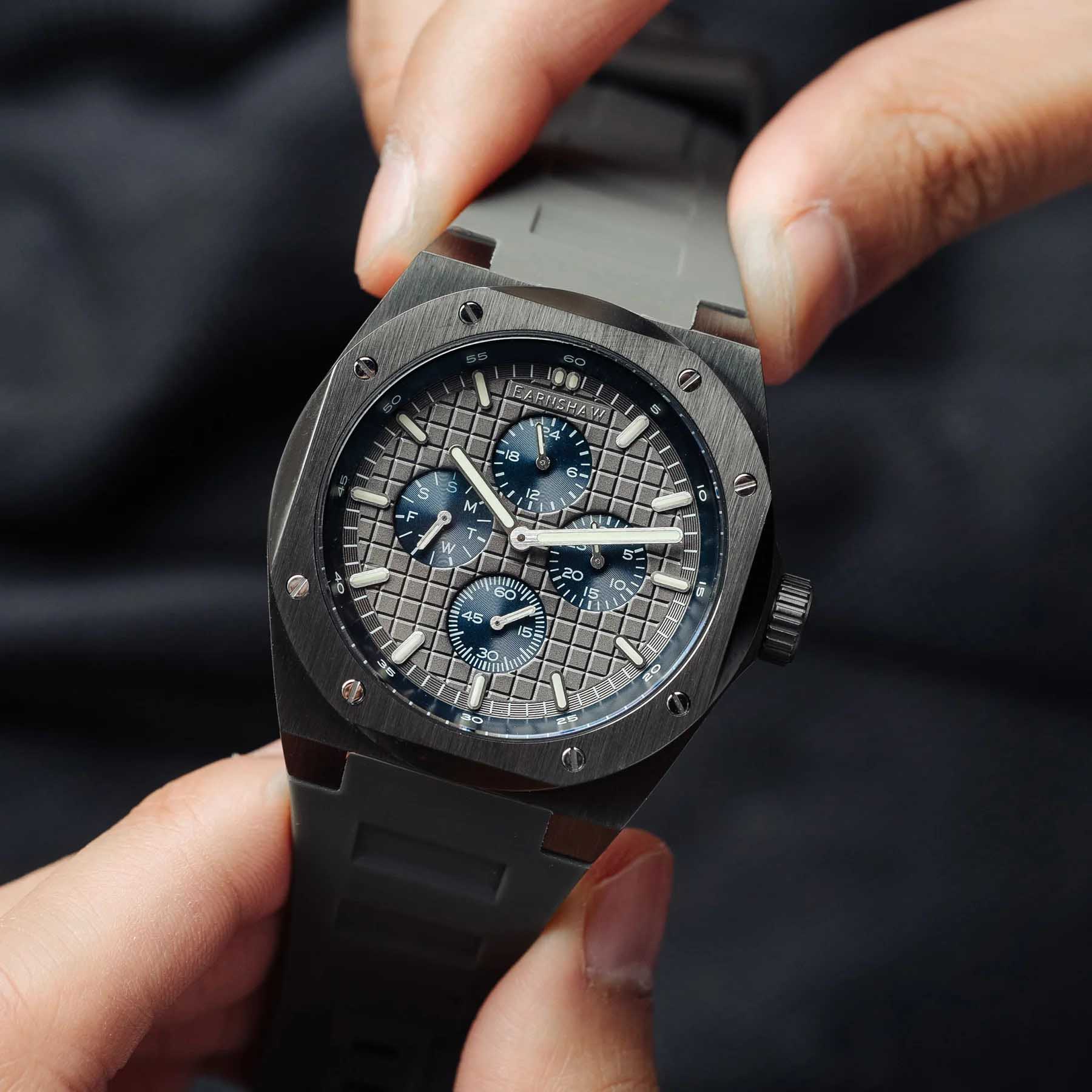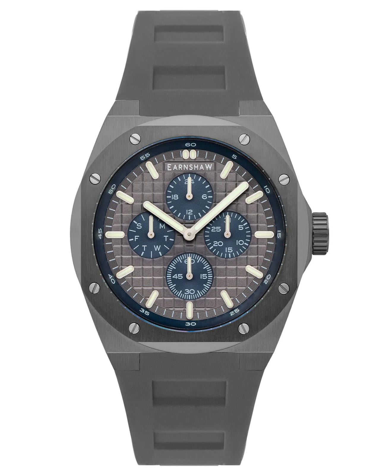 Мужские наручные часы с минеральным стекломМинеральное стеклоМинеральное стекло представляет собой искусственно выращенный минерал кварца. Такое стекло отличается особой устойчивостью к повреждениям и царапинам. Уступает по некоторым качествам сапфировому стеклу. Earnshaw Bessemer ES-8253-04, кварцевый механизм. Класс водозащиты: 100 метров, позволит защитить корпус от воды. Корпус часов изготовлен из стали. Отображение даты и дня недели в малых циферблатах. 12/24х часовой формат времени. Серый циферблат. Люминесцентная подсветкаЛюминесцентное покрытиеПозволяет считывать показания времени в темноте. Производители наносят на стрелки, часовые индексы, безель или поверхность циферблата светонакопительный состав, дающий холодное свечение.. Корпус выполнен из нержавеющей стали с серым IP-покрытиемIP-покрытиеМетод ионного напыления. Демонстрирует повышенную устойчивость к истиранию, окислению и химическим веществам. Под воздействием высокого давления и температуры около 1500°C молекулы металла надёжно соединяются с частицами корпуса часов.. Диаметр корпуса составляет 44 мм, толщина 14 мм. Серый силиконовый ремешок, стандартная застежка.